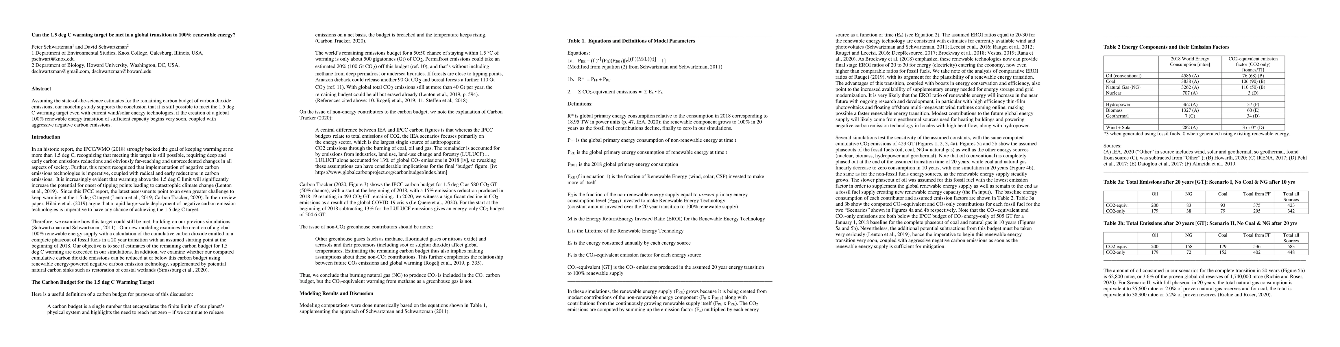 Assuming the state-of-the-science estimates for the remaining carbon budget of carbon dioxide emissions, our modeling study supports the conclusion that it is still possible to meet the 1.5 deg C warming target even with current wind/solar energy technologies, if the creation of a global 100% renewable energy transition of sufficient capacity begins very soon, coupled with aggressive negative carbon emissions.