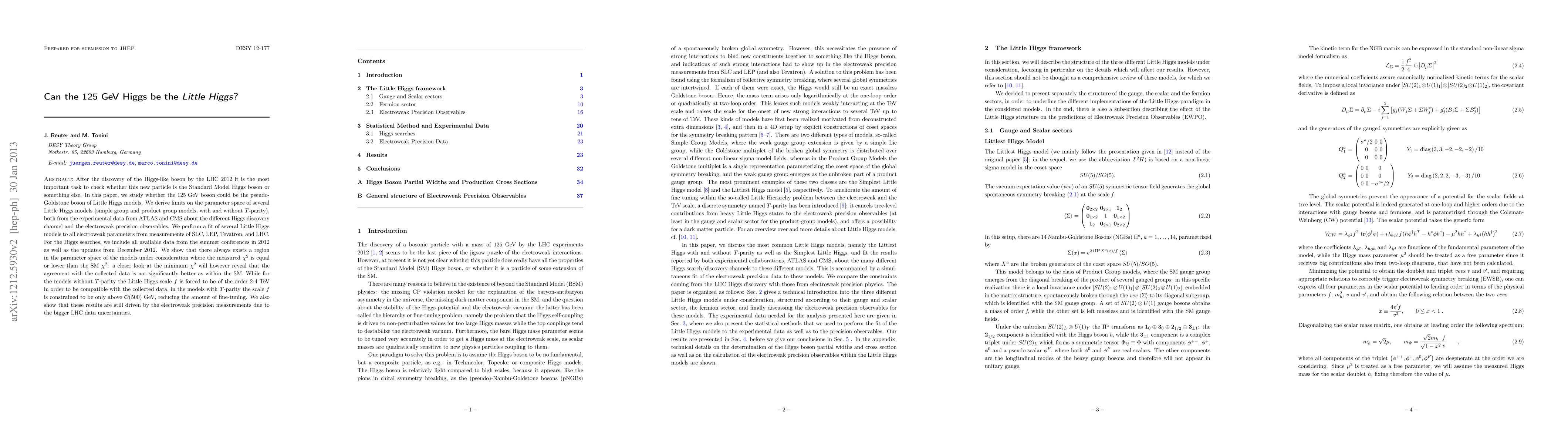 After the discovery of the Higgs-like boson by the LHC 2012 it is the most important task to check whether this new particle is the Standard Model Higgs boson or something else. In this paper, we study whether the 125 GeV boson could be the pseudo-Goldstone boson of Little Higgs models. We derive limits on the parameter space of several Little Higgs models (simple group and product group models, with and without T-parity), both from the experimental data from ATLAS and CMS about the different Higgs discovery channel and the electroweak precision observables. We perform a fit of several Little Higgs models to all electroweak parameters from measurements of SLC, LEP, Tevatron, and LHC. For the Higgs searches, we include all available data from the summer conferences in 2012 as well as the updates from December 2012. We show that there always exists a region in the parameter space of the models under consideration where the measured chi^2 is equal or lower than the SM chi^2: a closer look at the minimum chi^2 will however reveal that the agreement with the collected data is not significantly better as within the SM. While for the models without T-parity the Little Higgs scale f is forced to be of the order 2-4 TeV in order to be compatible with the collected data, in the models with T-parity the scale f is constrained to be only above O(500) GeV, reducing the amount of fine-tuning. We also show that these results are still driven by the electroweak precision measurements due to the bigger LHC data