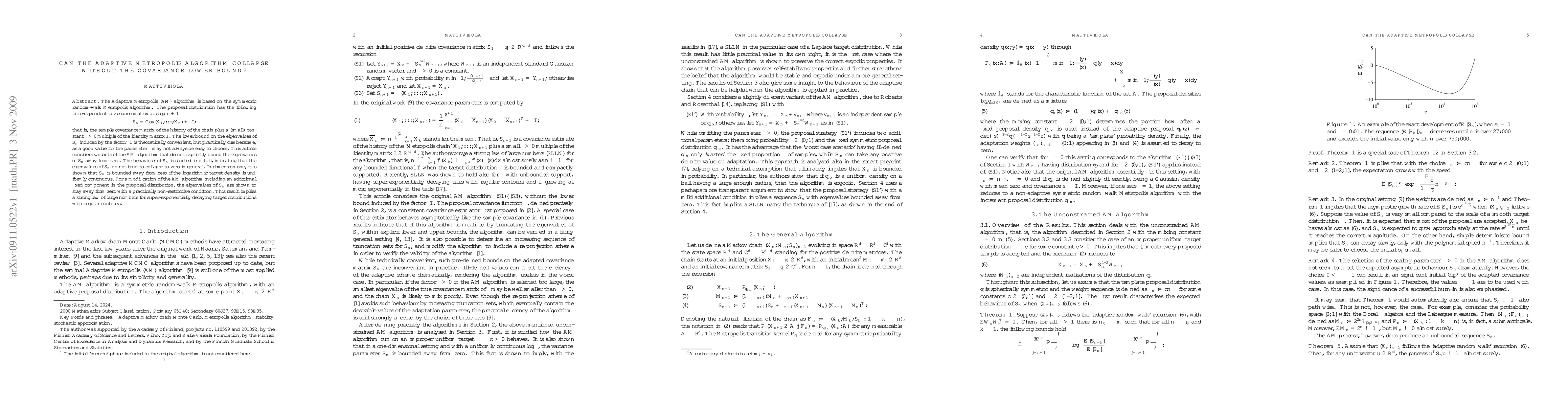 The paper analyzes the Adaptive Metropolis algorithm, examining its behavior without the covariance lower bound, focusing on the eigenvalues of the covariance matrix.