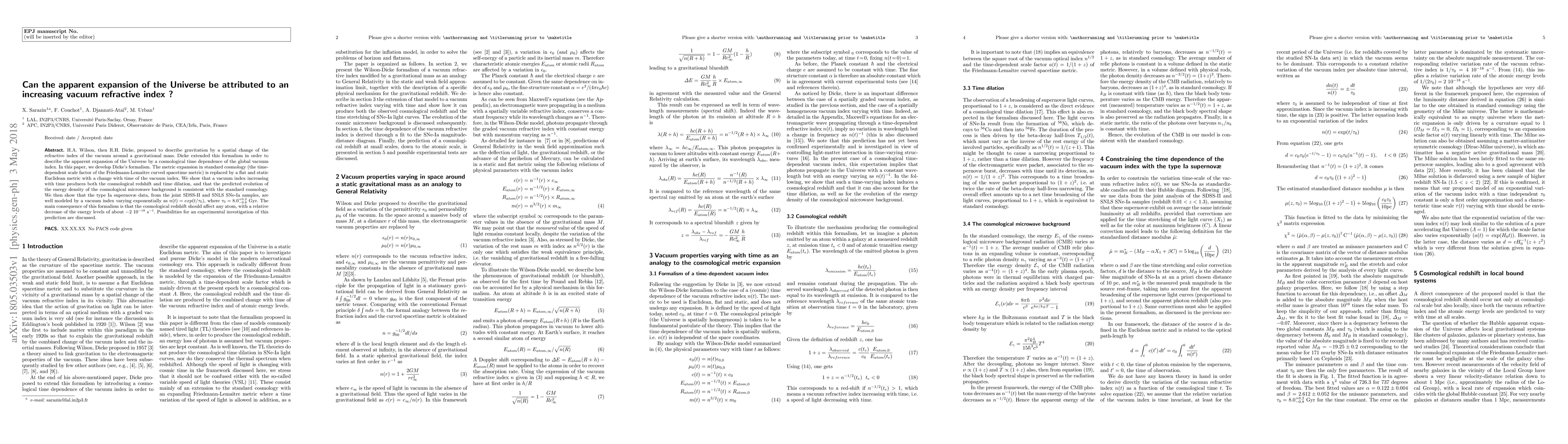 H.A. Wilson, then R.H. Dicke, proposed to describe gravitation by a spatial change of the refractive index of the vacuum around a gravitational mass. Dicke extended this formalism in order to describe the apparent expansion of the Universe by a cosmological time dependence of the global vacuum index. In this paper, we develop Dicke's formalism. The metric expansion in standard cosmology (the time-dependent scale factor of the Friedmann-Lema\^itre curved spacetime metric) is replaced by a flat and static Euclidean metric with a change with time of the vacuum index. We show that a vacuum index increasing with time produces both the cosmological redshift and time dilation, and that the predicted evolution of the energy density of the cosmological microwave background is consistent with the standard cosmology. We then show that the type Ia supernovae data, from the joint SDSS-II and SNLS SNe-Ia samples, are well modeled by a vacuum index varying exponentially as n(t)=exp(t/tau0), where tau0=8.0+0.2-0.8 Gyr. The main consequence of this formalism is that the cosmological redshift should affect any atom, with a relative decrease of the energy levels of about -2 10^{-18} per second. Possibilities for an experimental investigation of this prediction are discussed.