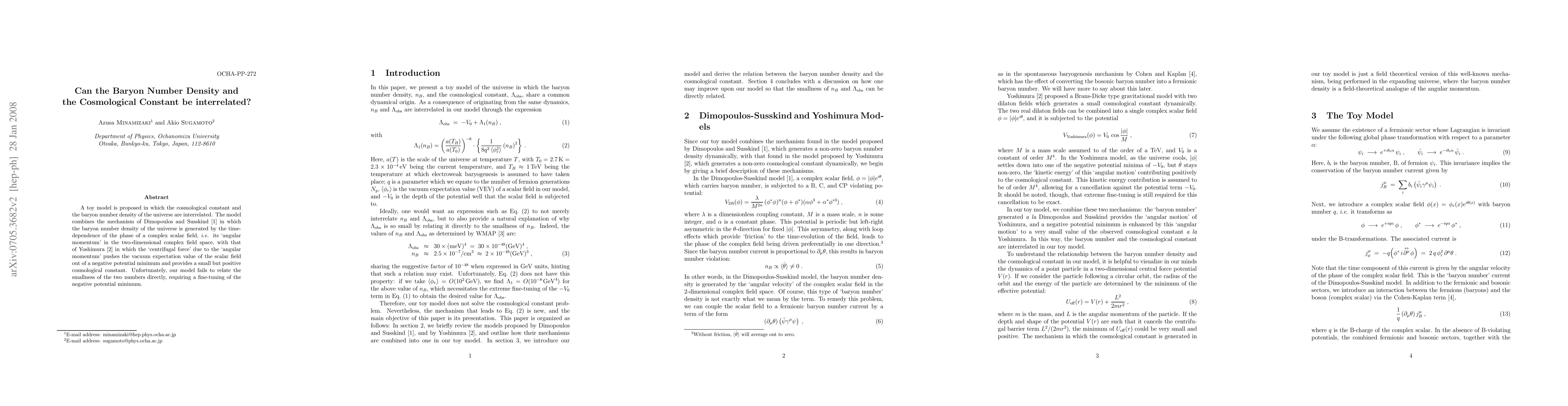 A toy model is proposed in which the cosmological constant and the baryon number density of the universe are interrelated. The model combines the mechanism of Dimopoulos and Susskind in which the baryon number density of the universe is generated by the time-dependence of the phase of a complex scalar field, i.e. its `angular momentum' in the two-dimensinal complex field space, with that of Yoshimura in which the `centrifugal force' due the `angular momentum' pushes the vacuum expectation value of the scalar field out of a negative potential minimum and provides a small but positive cosmological constant. Unfortunately, our model fails to relate the smallness of the two numbers directly, requiring a fine-tuning of the negative potential minimum.