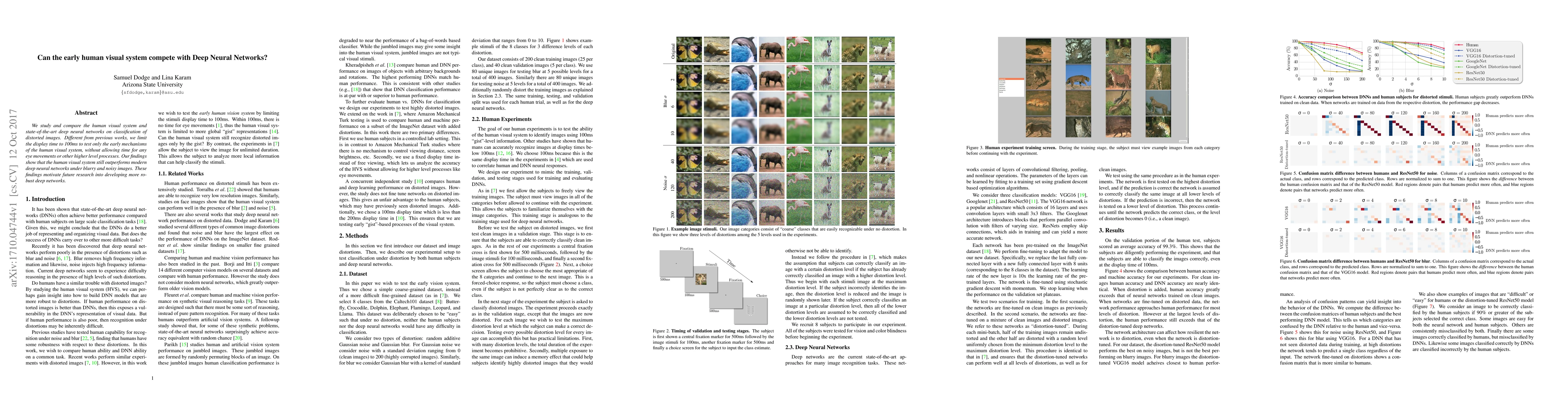 We study and compare the human visual system and state-of-the-art deep neural networks on classification of distorted images. Different from previous works, we limit the display time to 100ms to test only the early mechanisms of the human visual system, without allowing time for any eye movements or other higher level processes. Our findings show that the human visual system still outperforms modern deep neural networks under blurry and noisy images. These findings motivate future research into developing more robust deep networks.