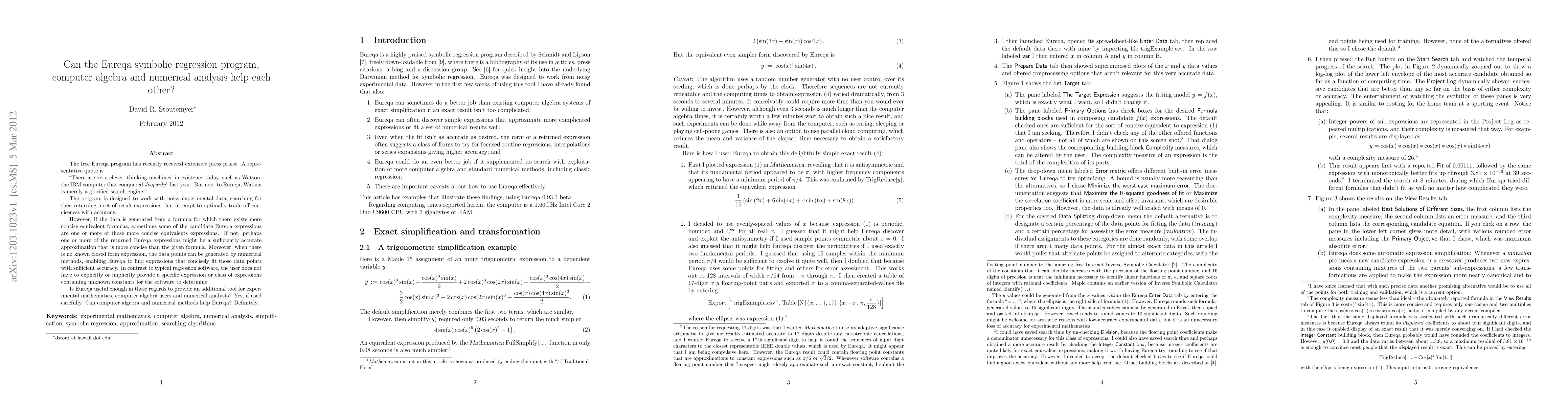 The Eureqa symbolic regression program has recently received extensive press praise. A representative quote is "There are very clever 'thinking machines' in existence today, such as Watson, the IBM computer that conquered Jeopardy! last year. But next to Eureqa, Watson is merely a glorified search engine." The program was designed to work with noisy experimental data. However, if the data is generated from an expression for which there exists more concise equivalent expressions, sometimes some of the Eureqa results are one or more of those more concise equivalents. If not, perhaps one or more of the returned Eureqa results might be a sufficiently accurate approximation that is more concise than the given expression. Moreover, when there is no known closed form expression, the data points can be generated by numerical methods, enabling Eureqa to find expressions that concisely fit those data points with sufficient accuracy. In contrast to typical regression software, the user does not have to explicitly or implicitly provide a specific expression or class of expressions containiing unknown constants for the software to determine. Is Eureqa useful enough in these regards to provide an additional tool for experimental mathematics, computer algebra users and numerical analysis? Yes if used carefully. Can computer algebra and numerical methods help Eureqa? Definitely.