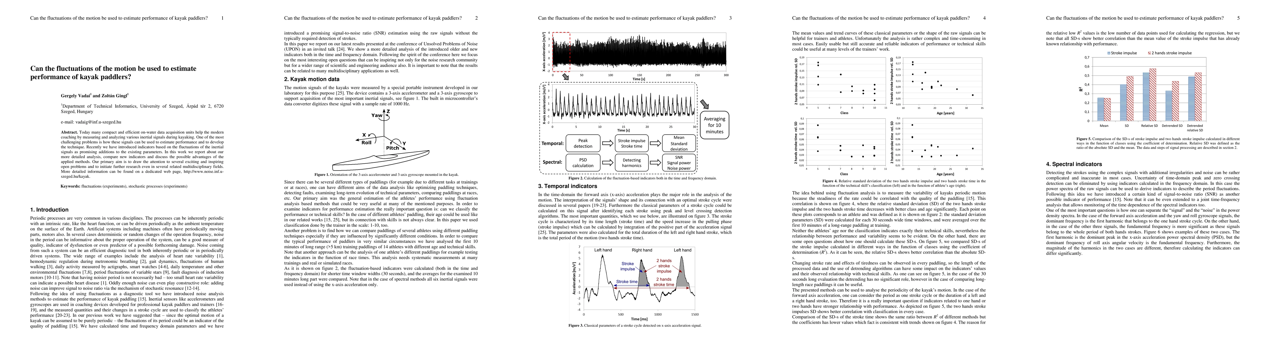 Today many compact and efficient on-water data acquisition units help the modern coaching by measuring and analyzing various inertial signals during kayaking. One of the most challenging problems is how these signals can be used to estimate performance and to develop the technique. Recently we have introduced indicators based on the fluctuations of the inertial signals as promising additions to the existing parameters. In this work we report about our more detailed analysis, compare new indicators and discuss the possible advantages of the applied methods. Our primary aim is to draw the attention to several exciting and inspiring open problems and to initiate further research even in several related multidisciplinary fields. More detailed information can be found on a dedicated web page, http://www.noise.inf.u-szeged.hu/kayak.
