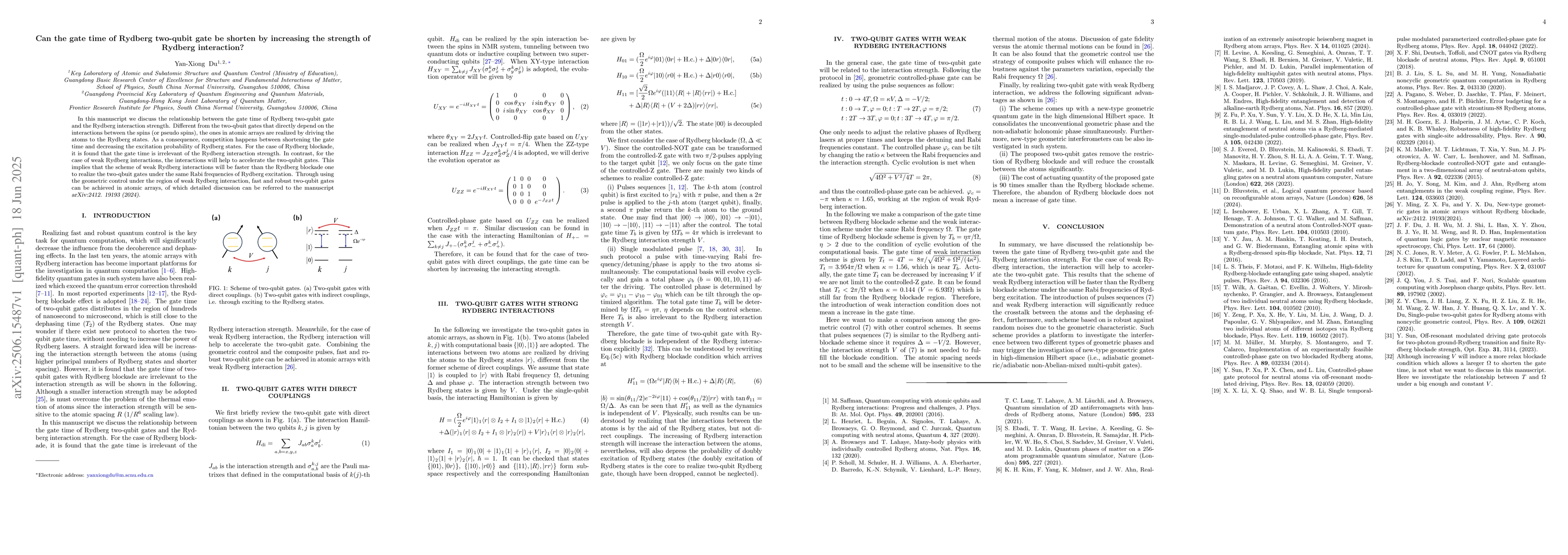In this manuscript we discuss the relationship between the gate time of Rydberg two-qubit gate and the Rydberg interaction strength. Different from the two-qbuit gates that directly depend on the interactions between the spins (or pseudo spins), the ones in atomic arrays are realized by driving the atoms to the Rydberg states. As a consequence, competition happens between shortening the gate time and decreasing the excitation probability of Rydberg states. For the case of Rydberg blockade, it is found that the gate time is irrelevant of the Rydberg interaction strength. In contrast, for the case of weak Rydberg interactions, the interactions will help to accelerate the two-qubit gates. This implies that the scheme of weak Rydberg interactions will be faster than the Rydberg blockade one to realize the two-qbuit gates under the same Rabi frequencies of Rydberg excitation. Through using the geometric control under the region of weak Rydberg interaction, fast and robust two-qubit gates can be achieved in atomic arrays, of which detailed discussion can be referred to the manuscript \textsl{arXiv:2412. 19193 (2024)}.