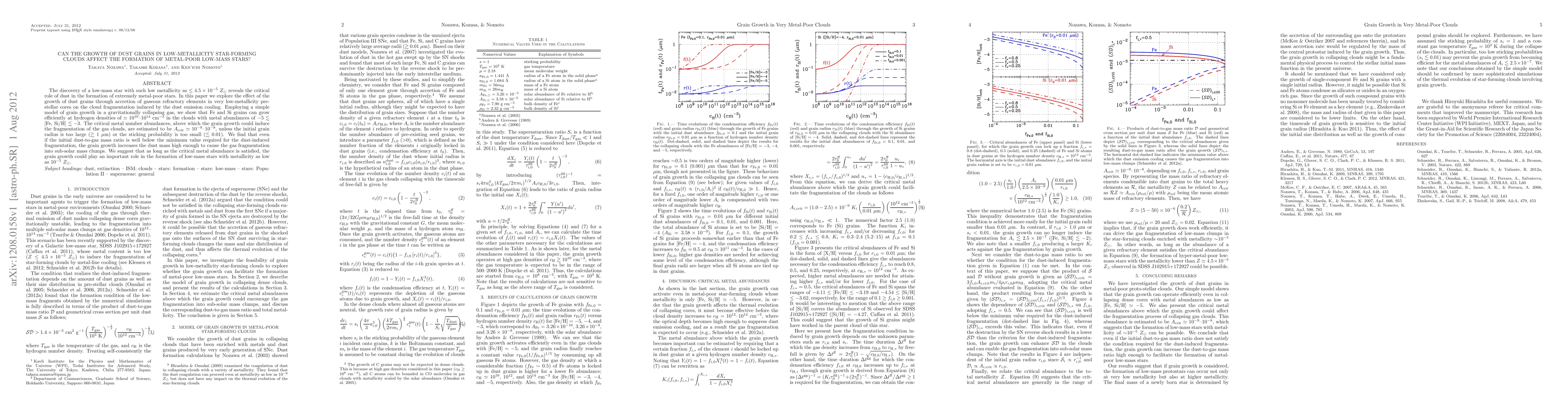 This paper investigates how the growth of dust grains in low-metallicity star-forming clouds can influence the formation of metal-poor low-mass stars. The study finds that efficient growth of Fe and Si grains can lead to gas cloud fragmentation, potentially forming stars with metallicities as low as 10^{-5} Z_sun, provided critical metal abundances are met.