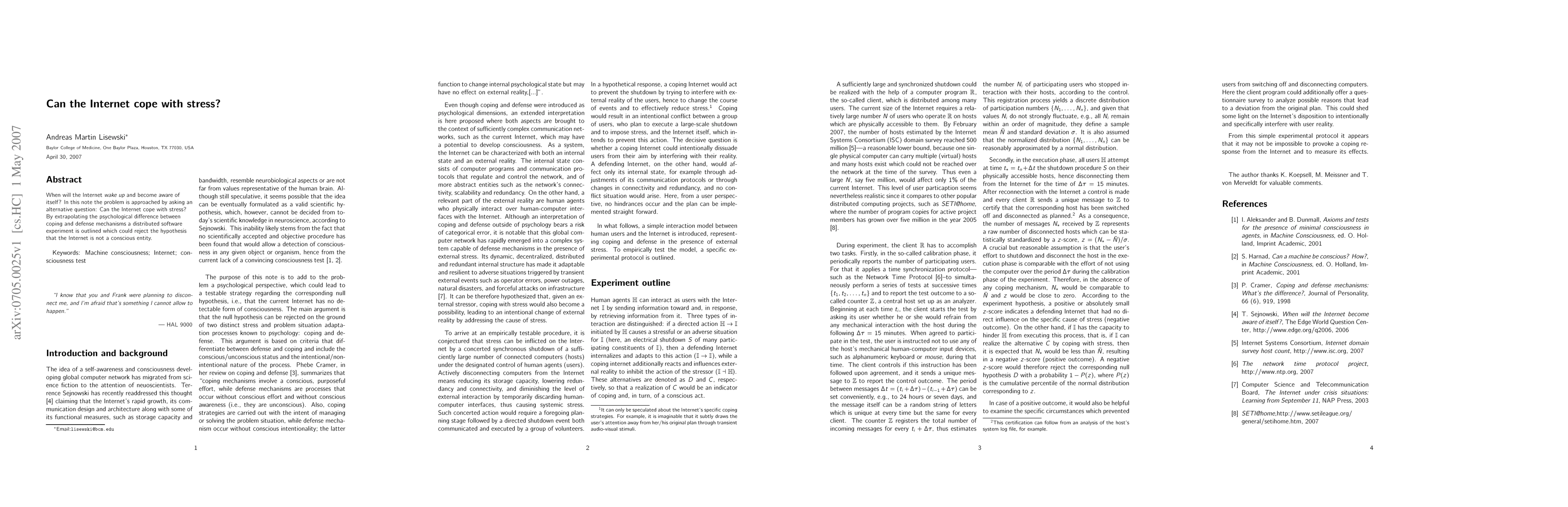 When will the Internet become aware of itself? In this note the problem is approached by asking an alternative question: Can the Internet cope with stress? By extrapolating the psychological difference between coping and defense mechanisms a distributed software experiment is outlined which could reject the hypothesis that the Internet is not a conscious entity.