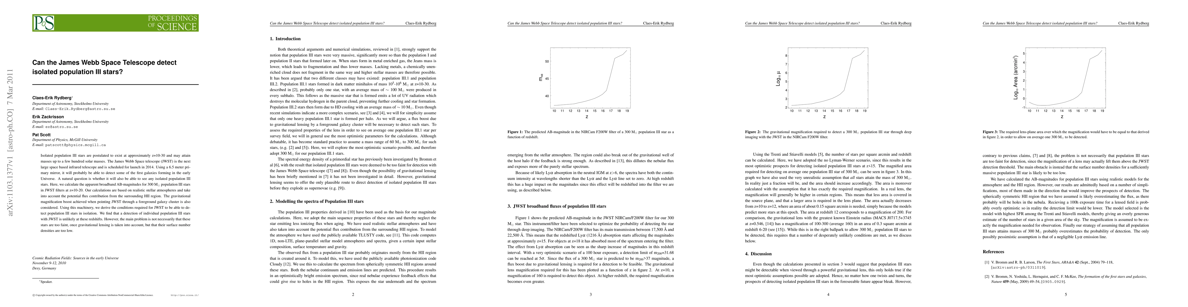 The James Webb Space Telescope (JWST) may detect early galaxies but is unlikely to observe isolated population III stars due to their low surface number densities, despite their potential brightness when gravitational lensing is considered.