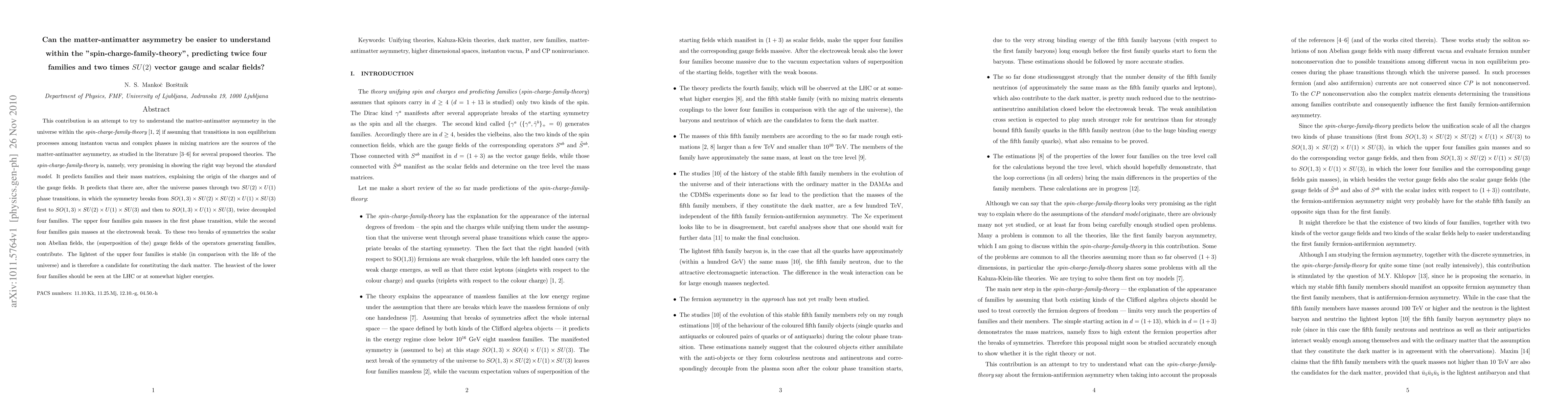 This contribution is an attempt to try to understand the matter-antimatter asymmetry in the universe within the {\it spin-charge-family-theory} if assuming that transitions in non equilibrium processes among instanton vacua and complex phases in mixing matrices are the sources of the matter-antimatter asymmetry, as studied in the literature for several proposed theories. The {\it spin-charge-family-theory} is, namely, very promising in showing the right way beyond the {\it standard model}. It predicts families and their mass matrices, explaining the origin of the charges and of the gauge fields. It predicts that there are, after the universe passes through two $SU(2)\times U(1)$ phase transitions, in which the symmetry breaks from $SO(1,3) \times SU(2) \times SU(2) \times U(1) \times SU(3)$ first to $SO(1,3) \times SU(2) \times U(1) \times SU(3)$ and then to $SO(1,3) \times U(1) \times SU(3)$, twice decoupled four families. The upper four families gain masses in the first phase transition, while the second four families gain masses at the electroweak break. To these two breaks of symmetries the scalar non Abelian fields, the (superposition of the) gauge fields of the operators generating families, contribute. The lightest of the upper four families is stable (in comparison with the life of the universe) and is therefore a candidate for constituting the dark matter. The heaviest of the lower four families should be seen at the LHC or at somewhat higher energies.