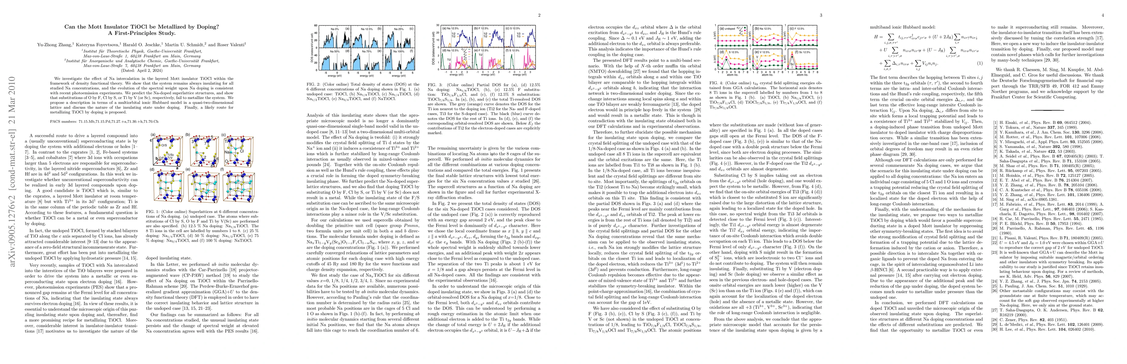 We investigate the effect of Na intercalation in the layered Mott insulator TiOCl within the framework of density functional theory. We show that the system remains always insulating for all studied Na concentrations, and the evolution of the spectral weight upon Na doping is consistent with recent photoemission experiments. We predict the Na-doped superlattice structures, and show that substitutions of O by F, Cl by S, or Ti by V (or Sc), respectively, fail to metallize the system. We propose a description in terms of a multiorbital ionic Hubbard model in a quasi-two-dimensional lattice and discuss the nature of the insulating state under doping. Finally, a likely route for metallizing TiOCl by doping is proposed.