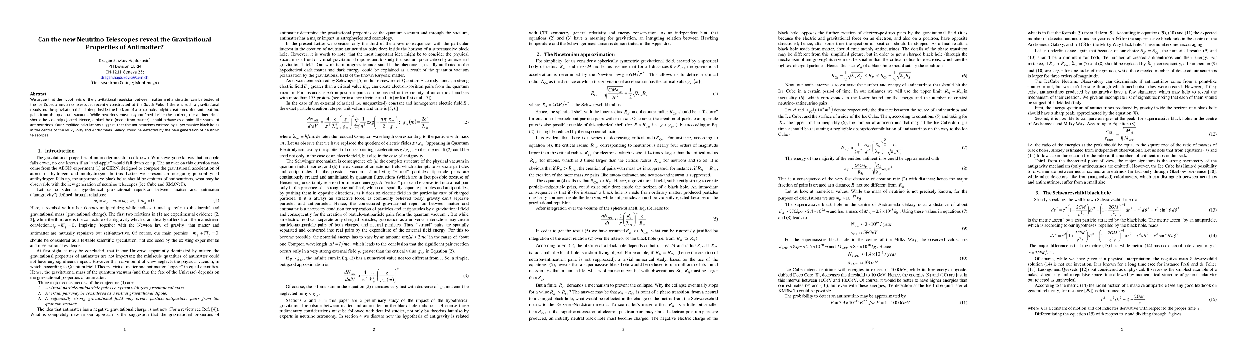We argue that the hypothesis of the gravitational repulsion between matter and antimatter can be tested at the Ice Cube, a neutrino telescope, recently constructed at the South Pole. If there is such a gravitational repulsion, the gravitational field, deep inside the horizon of a black hole, might create neutrino-antineutrino pairs from the quantum vacuum. While neutrinos must stay confined inside the horizon, the antineutrinos should be violently ejected. Hence, a black hole (made from matter) should behave as a point-like source of antineutrinos. Our simplified calculations suggest, that the antineutrinos emitted by supermassive black holes in the centre of the Milky Way and Andromeda Galaxy, could be detected by the new generation of neutrino telescopes.