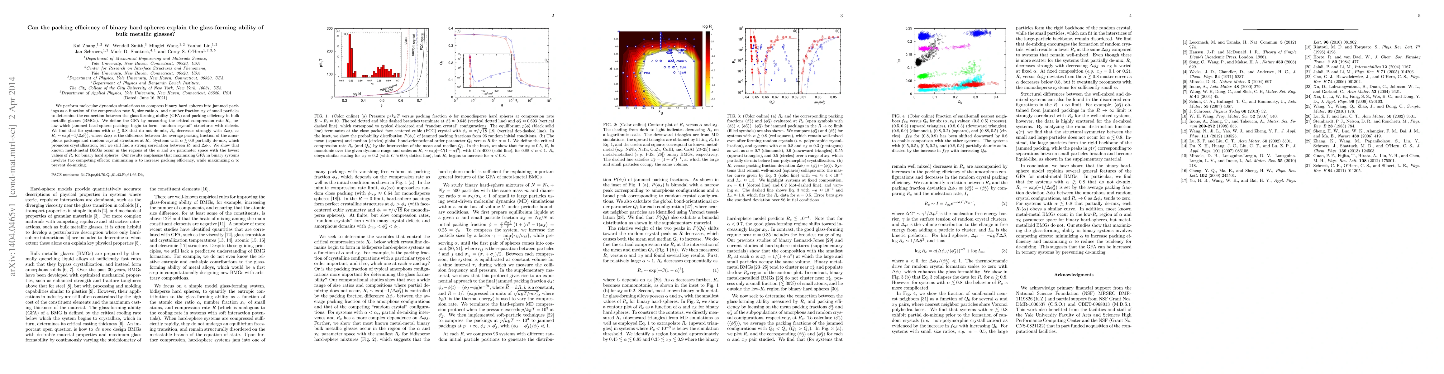 This study uses molecular dynamics simulations to explore how packing efficiency of binary hard spheres relates to the glass-forming ability of bulk metallic glasses. It finds that lower values of the critical compression rate $R_c$ correlate strongly with higher packing efficiency differences, $\Delta \phi_J$, indicating a complex interplay between size ratio and composition to optimize glass-forming ability.