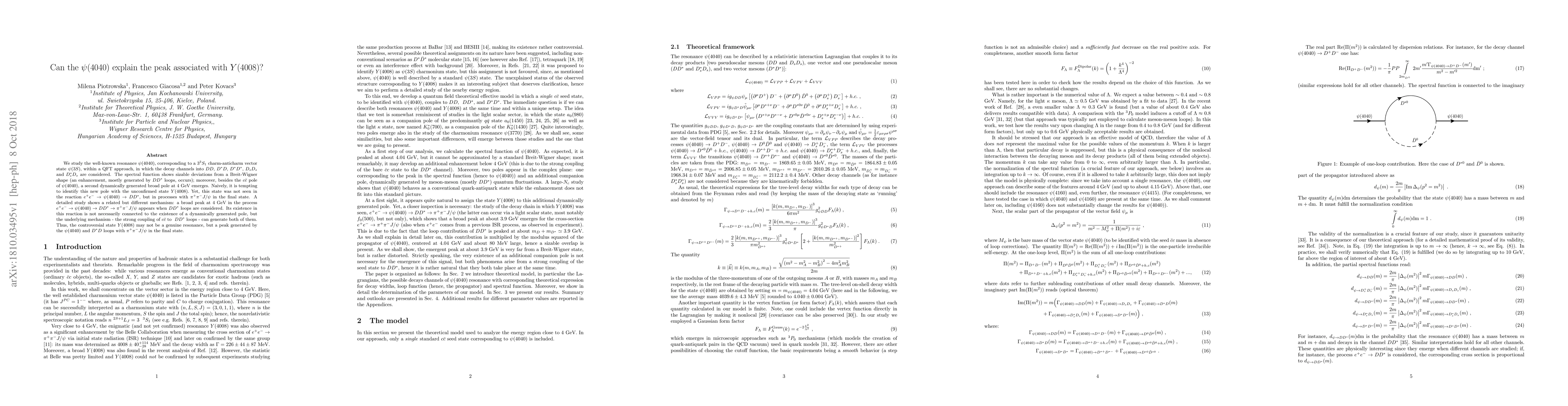 The research explores the $psi(4040)$ resonance, finding deviations from a typical Breit-Wigner shape due to loops involving $DD^ast$. A second, broad pole emerges at 4 GeV, tempting to associate it with the unconfirmed $Y(4008)$. However, detailed analysis reveals this peak arises from $psi(4040)$ and $D^ast D$ loops with $pi^+ pi^- J/psi$ in the final state, suggesting $Y(4008)$ might be a loop-induced effect rather than a genuine resonance.