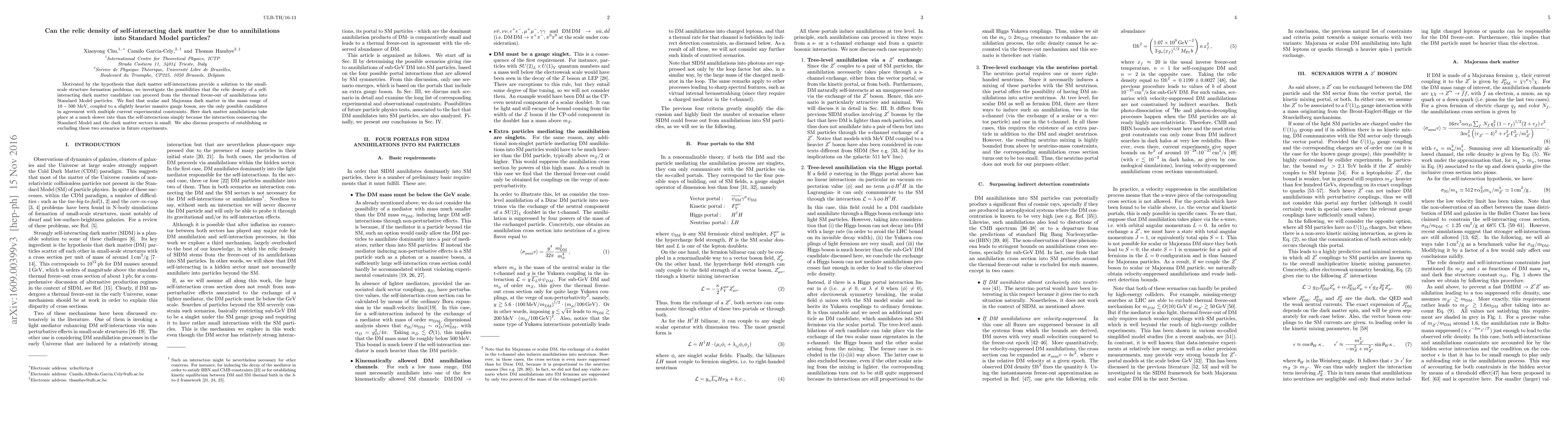 Motivated by the hypothesis that dark matter self-interactions provide a solution to the small-scale structure formation problems, we investigate the possibilities that the relic density of a self-interacting dark matter candidate can proceed from the thermal freeze-out of annihilations into Standard Model particles. We find that scalar and Majorana dark matter in the mass range of $10-500$ MeV, coupled to a slightly heavier massive gauge boson, are the only possible candidates in agreement with multiple current experimental constraints. Here dark matter annihilations take place at a much slower rate than the self-interactions simply because the interaction connecting the Standard Model and the dark matter sectors is small. We also discuss prospects of establishing or excluding these two scenarios in future experiments.