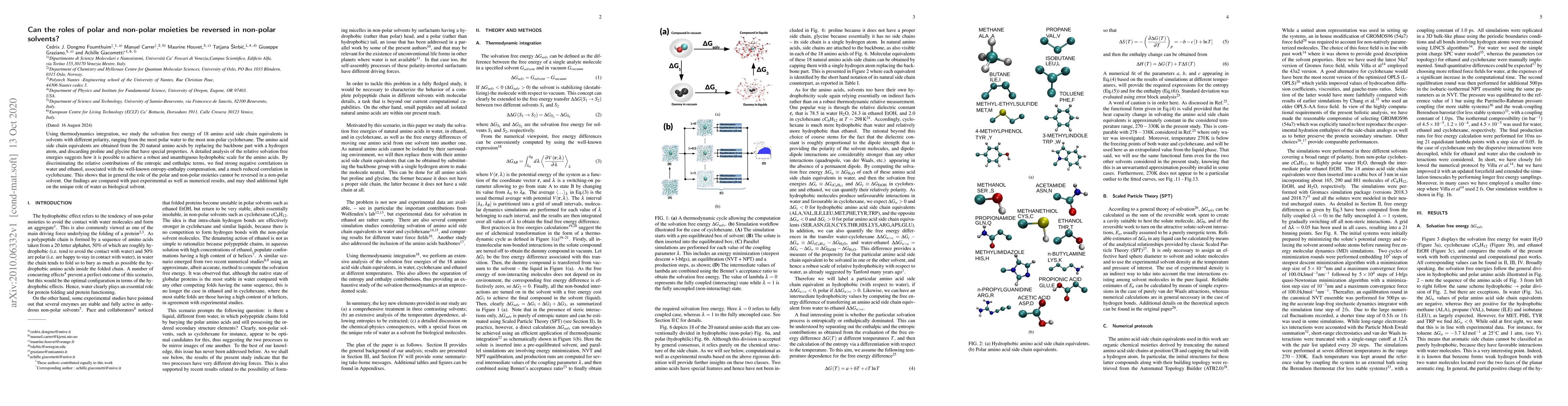 This study uses thermodynamics integration to analyze the solvation free energy of amino acid side chains in solvents of varying polarity, revealing that the roles of polar and non-polar moieties cannot be reversed in non-polar solvents, as evidenced by reduced entropy-enthalpy compensation compared to polar solvents. The findings highlight the unique role of water as a biological solvent.