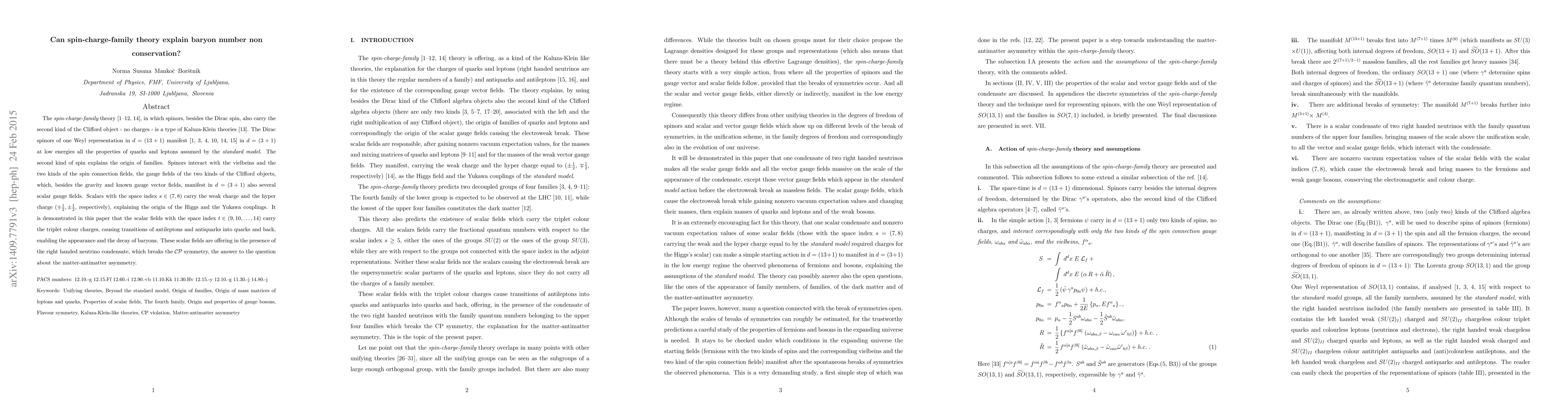 The spin-charge-family theory, in which spinors carry besides the Dirac spin also the second kind of the Clifford object, no charges, is a kind of the Kaluza-Klein theories. The Dirac spinors of one Weyl representation in $d=(13+1)$ manifest in $d=(3+1)$ at low energies all the properties of quarks and leptons assumed by the standard model. The second kind of spins explains the origin of families. Spinors interact with the vielbeins and the two kinds of the spin connection fields, the gauge fields of the two kinds of the Clifford objects, which manifest in $d=(3+1)$ besides the gravity and the known gauge vector fields also several scalar gauge fields. Scalars with the space index $s\in (7,8)$ carry the weak charge and the hyper charge ($\mp \frac{1}{2}, \pm \frac{1}{2}$, respectively), explaining the origin of the Higgs and the Yukawa couplings. It is demonstrated in this paper that the scalar fields with the space index $t\in (9,10,\dots,14)$ carry the triplet colour charges, causing transitions of antileptons and antiquarks into quarks and back, enabling the appearance and the decay of baryons. These scalar fields are offering in the presence of the right handed neutrino condensate, which breaks the ${\cal C}{\cal P}$ symmetry, the answer to the question about the matter-antimatter asymmetry.