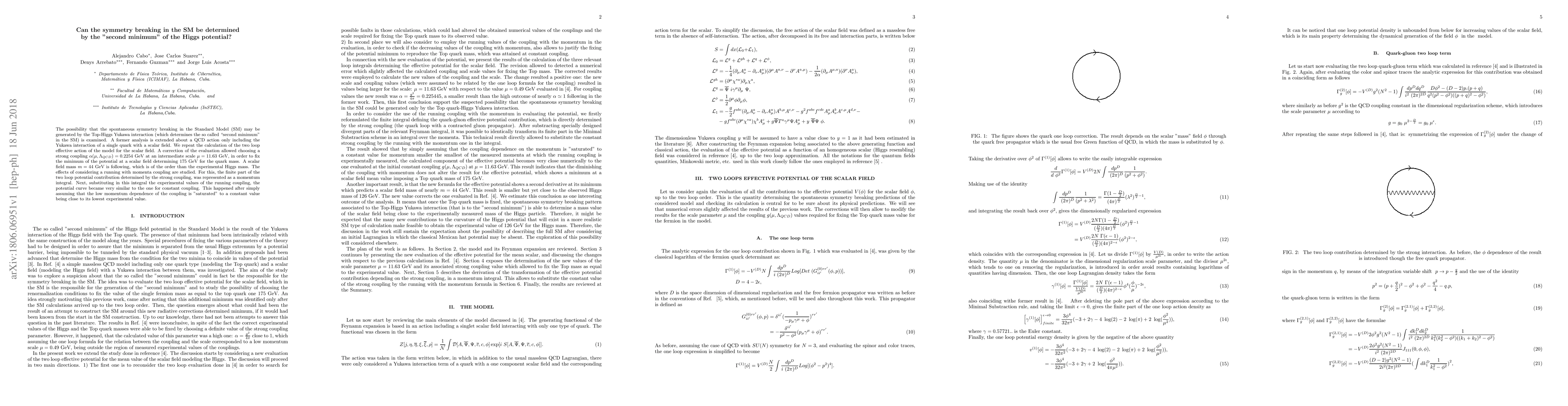 The possibility that the spontaneous symmetry breaking in the Standard Model (SM) may be generated by the Top-Higgs Yukawa interaction (which determines the so called "second minimum" in the SM) is examined. A former analysis is extended about a QCD action only including the Yukawa interaction of a single quark with a scalar field. We repeat the calculation of the two loop effective action of the model for the scalar field. A correction of the evaluation allowed choosing a strong coupling $\alpha $($\mu,\Lambda_{QCD})=0.2254$ GeV at an intermediate scale $\mu=11.63$ GeV, in order to fix the minimum of the potential at a scalar field determining $175$ GeV for the quark mass. A scalar field mass $m=44$ GeV is following, which is of the order than the experimental Higgs mass. The effects of considering a running with momenta coupling are studied. For this, the finite part of the two loop potential contribution determined by the strong coupling, was represented as a momentum integral. Next, substituting in this integral the experimental values of the running coupling, the potential curve became very similar to the one for constant coupling. This happened after simply assuming that the low momentum dependence of the coupling is "saturated" to a constant value being close to its lowest experimental value.
