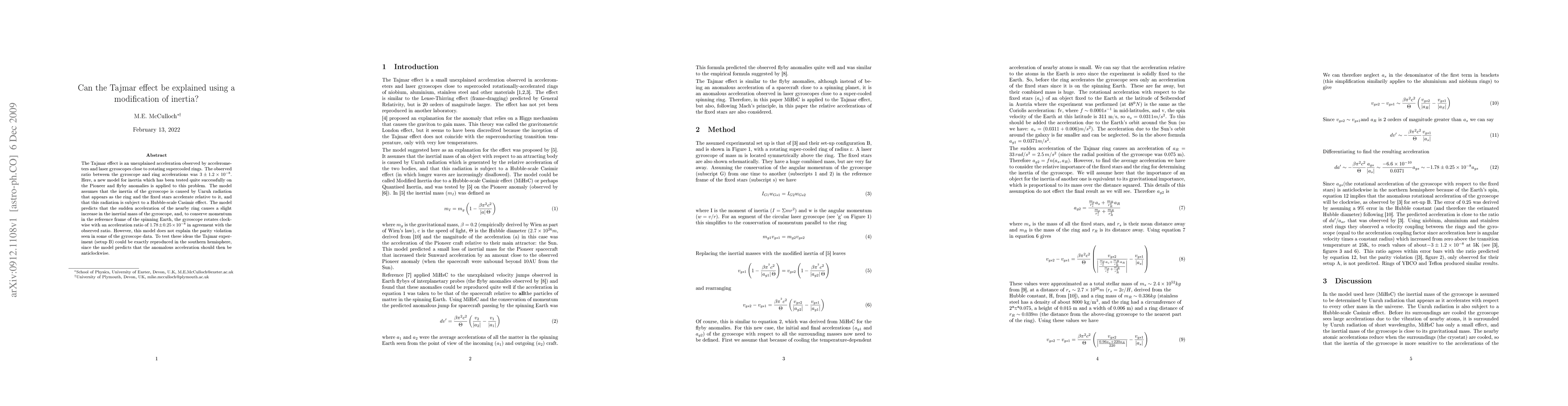 The Tajmar effect, an unexplained acceleration near rotating supercooled rings, is analyzed using a modified inertia model based on Unruh radiation and a Hubble-scale Casimir effect, which aligns with observed acceleration ratios but fails to explain parity violations. Further experiments in the southern hemisphere could test this model's predictions.