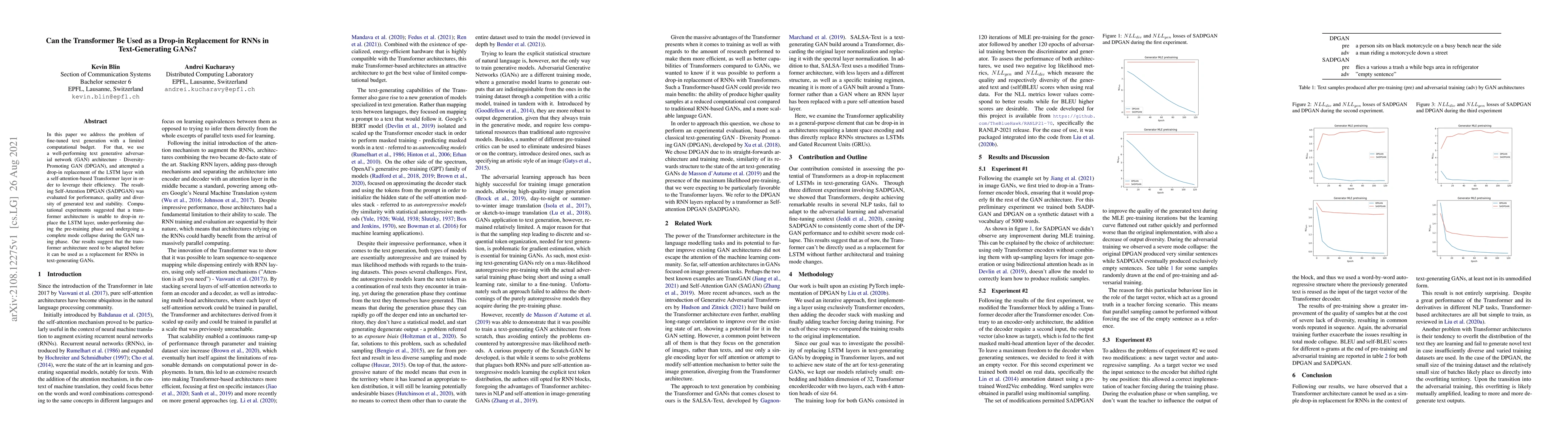This paper investigates whether a Transformer can replace LSTM layers in text-generating GANs (DPGAN), finding that the Transformer underperforms and leads to mode collapse. Adaptation of the Transformer architecture is suggested for successful use in this context.