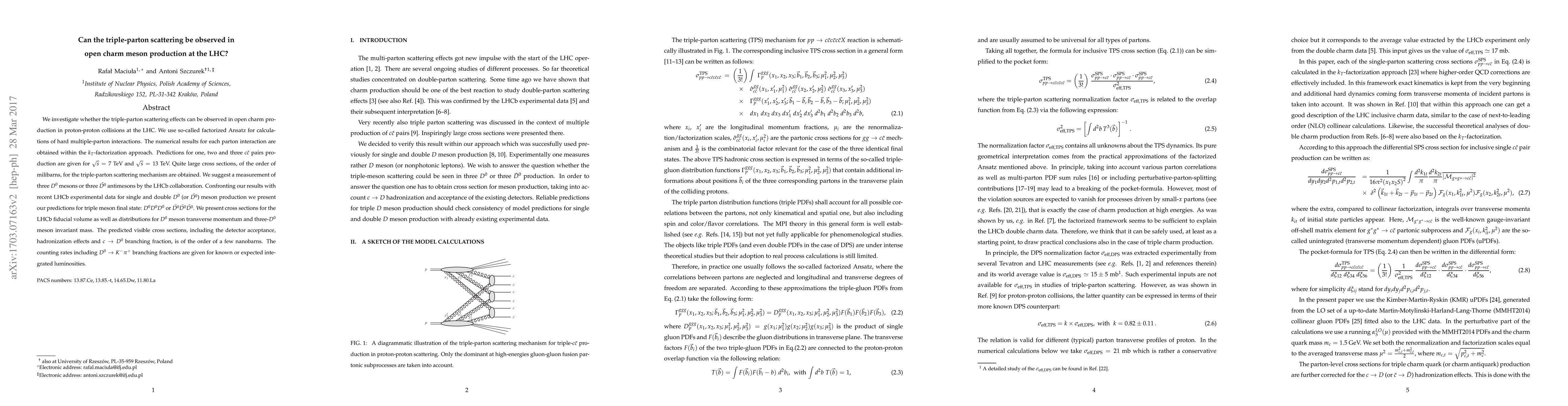 We investigate whether the triple-parton scattering effects can be observed in open charm production in proton-proton collisions at the LHC. We use so-called factorized Ansatz for calculations of hard multiple-parton interactions. The numerical results for each parton interaction are obtained within the $k_{T}$-factorization approach. Predictions for one, two and three $c\bar c$ pairs production are given for $\sqrt{s}= 7$ TeV and $\sqrt{s}= 13$ TeV. Quite large cross sections, of the order of milibarns, for the triple-parton scattering mechanism are obtained. We suggest a measurement of three $D^{0}$ mesons or three $\bar{D^{0}}$ antimesons by the LHCb collaboration. Confronting our results with recent LHCb experimental data for single and double $D^{0}$ (or $\bar{D^{0}}$) meson production we present our predictions for triple meson final state: $D^{0}D^{0}D^{0}$ or $\bar{D^{0}}\bar{D^{0}}\bar{D^{0}}$. We present cross sections for the LHCb fiducial volume as well as distributions for $D^{0}$ meson transverse momentum and three-$D^{0}$ meson invariant mass. The predicted visible cross sections, including the detector acceptance, hadronization effects and $c \to D^{0}$ branching fraction, is of the order of a few nanobarns. The counting rates including $D^{0} \to K^{-}\pi^{+}$ branching fractions are given for known or expected integrated luminosities.