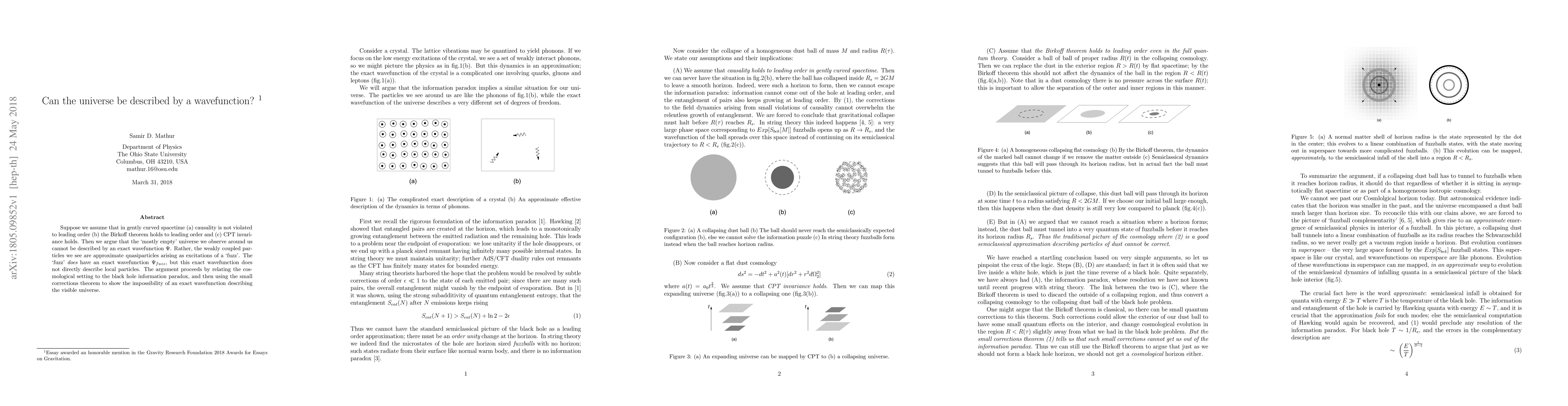 The paper argues that due to gently curved spacetime, CPT invariance, and Birkoff theorem, our observable universe can't be described by an exact wavefunction. Instead, visible particles are quasiparticles from a 'fuzz' with its own exact wavefunction, which doesn't directly correspond to local particles.