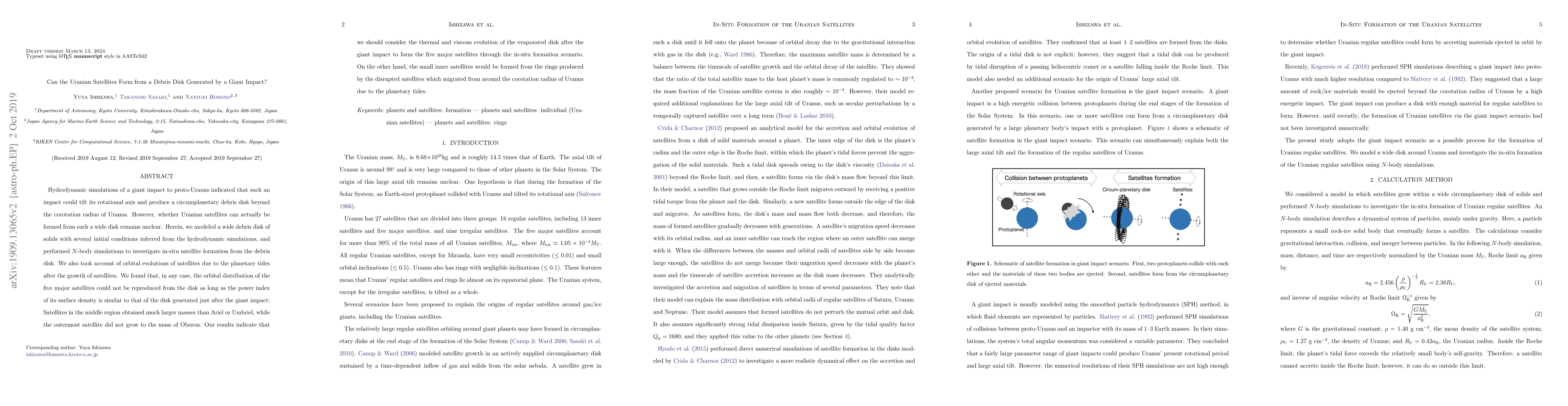 This study investigates whether Uranian satellites could form from a debris disk generated by a giant impact on proto-Uranus. The research found that the current orbital distribution of the five major satellites cannot be reproduced from the disk, suggesting alternative formation mechanisms are needed.