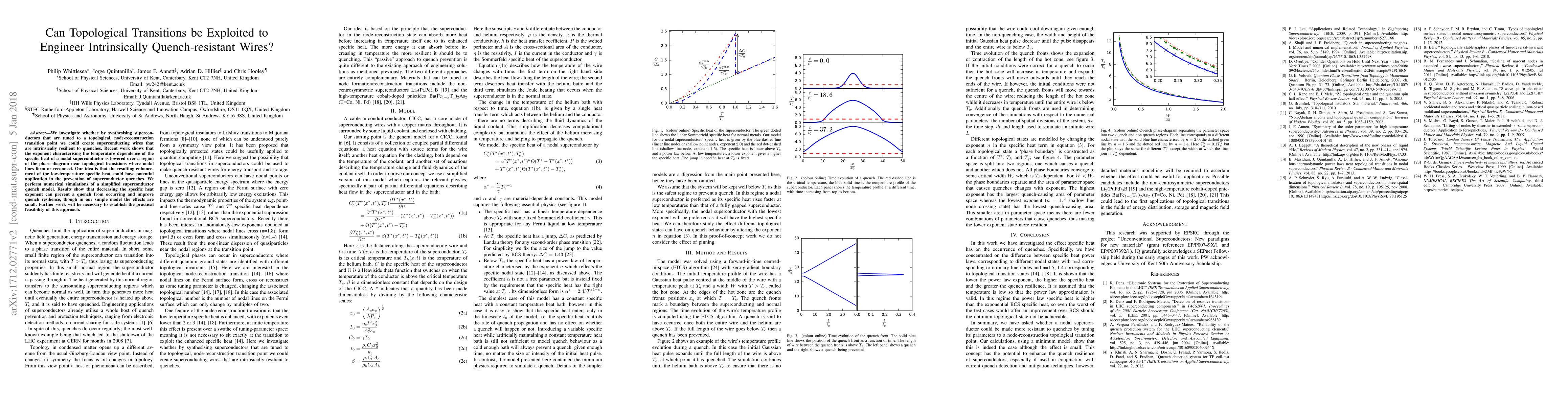 We investigate whether by synthesising superconductors that are tuned to a topological, node-reconstruction transition point we could create superconducting wires that are intrinsically resilient to quenches. Recent work shows that the exponent characterising the temperature dependence of the specific heat of a nodal superconductor is lowered over a region of the phase diagram near topological transitions where nodal lines form or reconnect. Our idea is that the resulting enhancement of the low-temperature specific heat could have potential application in the prevention of superconductor quenches. We perform numerical simulations of a simplified superconductor quench model. Results show that decreasing the specific heat exponent can prevent a quench from occurring and improve quench resilience, though in our simple model the effects are small. Further work will be necessary to establish the practical feasibility of this approach.