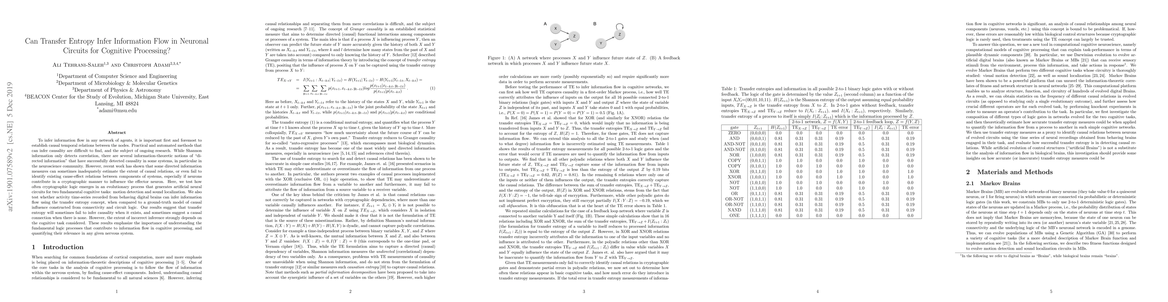 To infer information flow in any network of agents, it is important first and foremost to establish causal temporal relations between the nodes. Practical and automated methods that can infer causality are difficult to find, and the subject of ongoing research. While Shannon information only detects correlation, there are several information-theoretic notions of "directed information" that have successfully detected causality in some systems, in particular in the neuroscience community. However, recent work has shown that some directed information measures can sometimes inadequately estimate the extent of causal relations, or even fail to identify existing cause-effect relations between components of systems, especially if neurons contribute in a cryptographic manner to influence the effector neuron. Here, we test how often cryptographic logic emerges in an evolutionary process that generates artificial neural circuits for two fundamental cognitive tasks: motion detection and sound localization. We also test whether activity time-series recorded from behaving digital brains can infer information flow using the transfer entropy concept, when compared to a ground-truth model of causal influence constructed from connectivity and circuit logic. Our results suggest that transfer entropy will sometimes fail to infer causality when it exists, and sometimes suggest a causal connection when there is none. However, the extent of incorrect inference strongly depends on the cognitive task considered. These results emphasize the importance of understanding the fundamental logic processes that contribute to information flow in cognitive processing, and quantifying their relevance in any given nervous system.