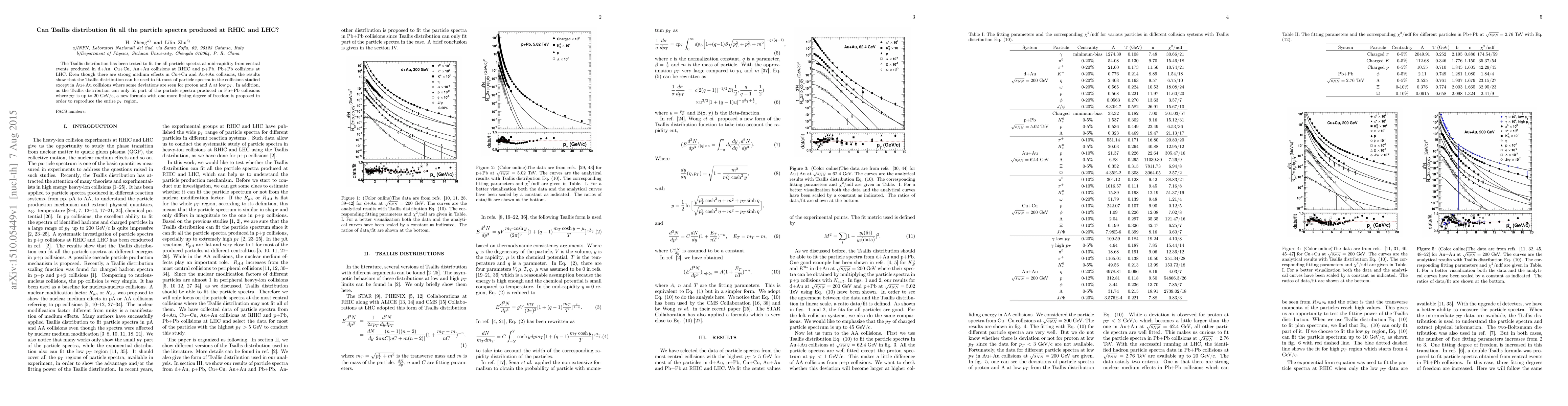 The Tsallis distribution has been tested to fit the all particle spectra at mid-rapidity from central events produced in d+Au, Cu+Cu, Au+Au collisions at RHIC and p+Pb, Pb+Pb collisions at LHC. Even though there are strong medium effects in Cu+Cu and Au+Au collisions, the results show that the Tsallis distribution can be used to fit most of particle spectra in the collisions studied except in Au+Au collisions where some deviations are seen for proton and $\Lambda$ at low $p_T$. In addition, as the Tsallis distribution can only fit part of the particle spectra produced in Pb+Pb collisions where $p_T$ is up to 20 GeV/c, a new formula with one more fitting degree of freedom is proposed in order to reproduce the entire $p_T$ region.
