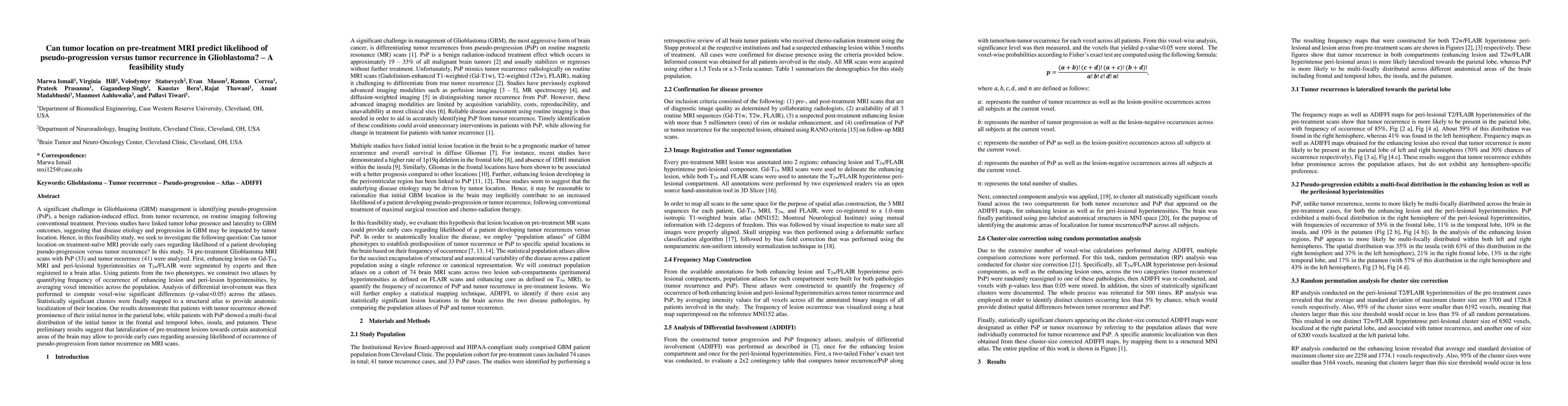 This study investigates whether tumor location on pre-treatment MRI can predict pseudo-progression versus tumor recurrence in Glioblastoma. Results show that recurrence is often linked to tumors in the parietal lobe, while pseudo-progression is associated with multi-focal tumors in the frontal, temporal, insula, and putamen regions.