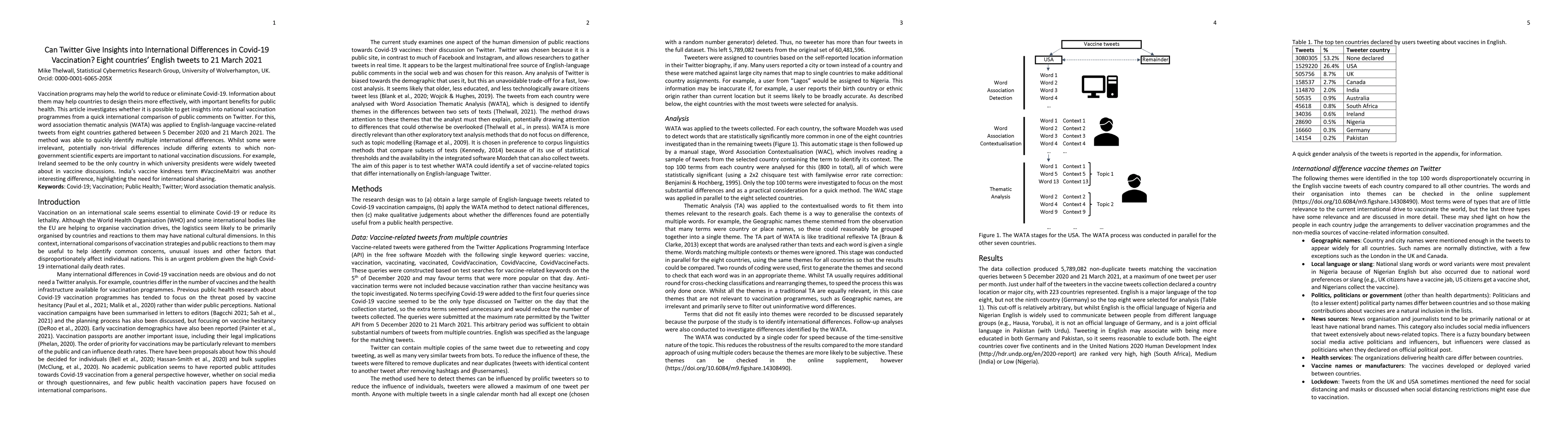 Vaccination programs may help the world to reduce or eliminate Covid-19. Information about them may help countries to design theirs more effectively, with important benefits for public health. This article investigates whether it is possible to get insights into national vaccination programmes from a quick international comparison of public comments on Twitter. For this, word association thematic analysis (WATA) was applied to English-language vaccine-related tweets from eight countries gathered between 5 December 2020 and 21 March 2021. The method was able to quickly identify multiple international differences. Whilst some were irrelevant, potentially non-trivial differences include differing extents to which non-government scientific experts are important to national vaccination discussions. For example, Ireland seemed to be the only country in which university presidents were widely tweeted about in vaccine discussions. India's vaccine kindness term #VaccineMaitri was another interesting difference, highlighting the need for international sharing.