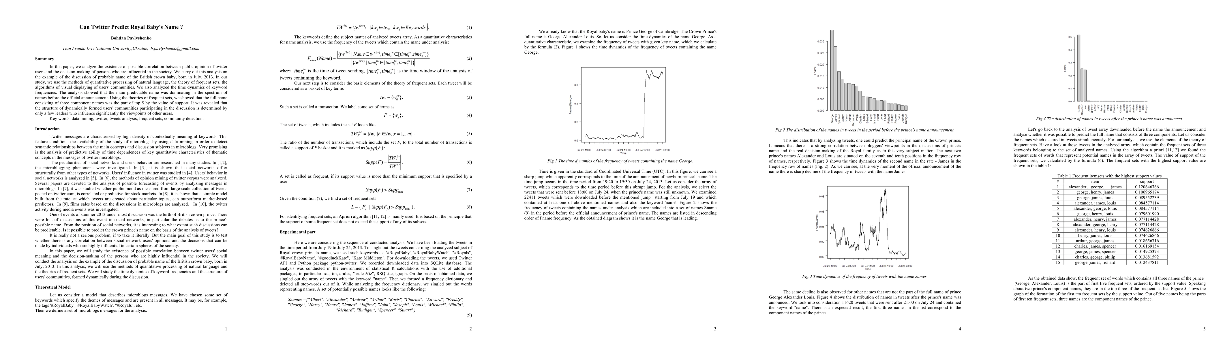 In this paper, we analyze the existence of possible correlation between public opinion of twitter users and the decision-making of persons who are influential in the society. We carry out this analysis on the example of the discussion of probable name of the British crown baby, born in July, 2013. In our study, we use the methods of quantitative processing of natural language, the theory of frequent sets, the algorithms of visual displaying of users' communities. We also analyzed the time dynamics of keyword frequencies. The analysis showed that the main predictable name was dominating in the spectrum of names before the official announcement. Using the theories of frequent sets, we showed that the full name consisting of three component names was the part of top 5 by the value of support. It was revealed that the structure of dynamically formed users' communities participating in the discussion is determined by only a few leaders who influence significantly the viewpoints of other users.