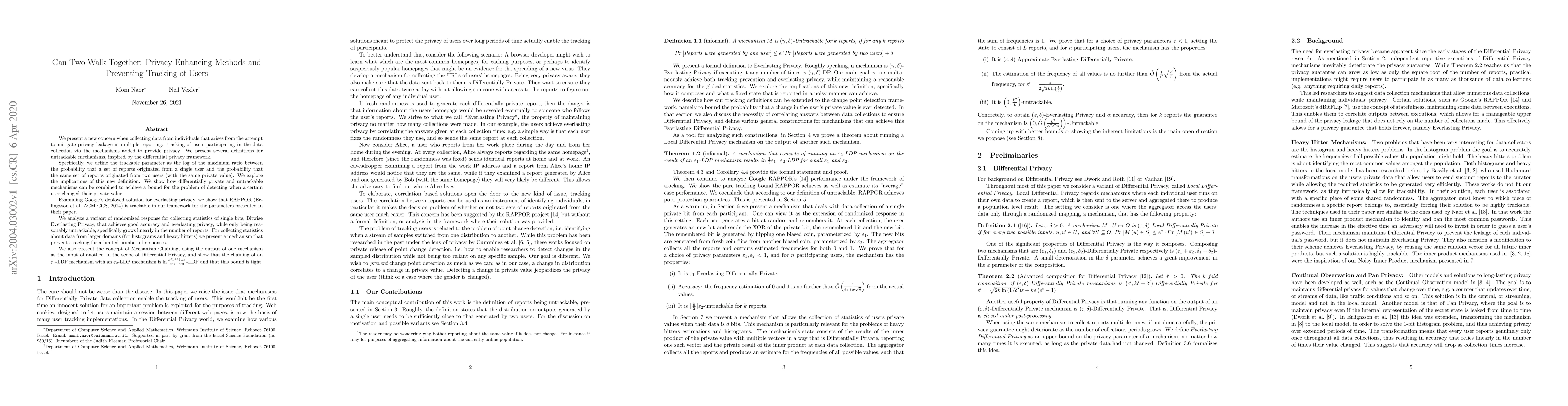 We present a new concern when collecting data from individuals that arises from the attempt to mitigate privacy leakage in multiple reporting: tracking of users participating in the data collection via the mechanisms added to provide privacy. We present several definitions for untrackable mechanisms, inspired by the differential privacy framework. Specifically, we define the trackable parameter as the log of the maximum ratio between the probability that a set of reports originated from a single user and the probability that the same set of reports originated from two users (with the same private value). We explore the implications of this new definition. We show how differentially private and untrackable mechanisms can be combined to achieve a bound for the problem of detecting when a certain user changed their private value. Examining Google's deployed solution for everlasting privacy, we show that RAPPOR (Erlingsson et al. ACM CCS, 2014) is trackable in our framework for the parameters presented in their paper. We analyze a variant of randomized response for collecting statistics of single bits, Bitwise Everlasting Privacy, that achieves good accuracy and everlasting privacy, while only being reasonably untrackable, specifically grows linearly in the number of reports. For collecting statistics about data from larger domains (for histograms and heavy hitters) we present a mechanism that prevents tracking for a limited number of responses. We also present the concept of Mechanism Chaining, using the output of one mechanism as the input of another, in the scope of Differential Privacy, and show that the chaining of an $\varepsilon_1$-LDP mechanism with an $\varepsilon_2$-LDP mechanism is $\ln\frac{e^{\varepsilon_1+\varepsilon_2}+1}{e^{\varepsilon_1}+e^{\varepsilon_2}}$-LDP and that this bound is tight.
