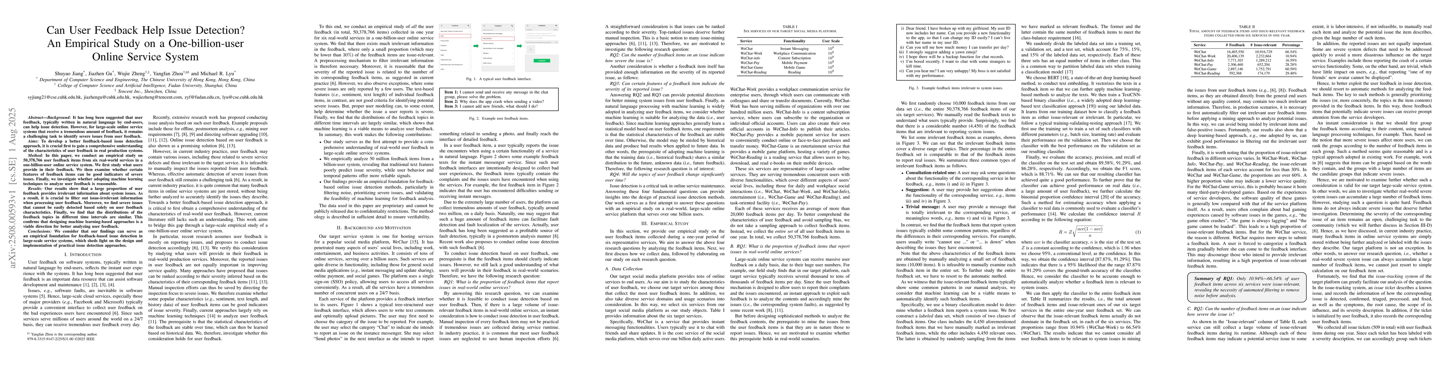 Background: It has long been suggested that user feedback, typically written in natural language by end-users, can help issue detection. However, for large-scale online service systems that receive a tremendous amount of feedback, it remains a challenging task to identify severe issues from user feedback. Aims: To develop a better feedback-based issue detection approach, it is crucial first to gain a comprehensive understanding of the characteristics of user feedback in real production systems. Method: In this paper, we conduct an empirical study on 50,378,766 user feedback items from six real-world services in a one-billion-user online service system. We first study what users provide in their feedback. We then examine whether certain features of feedback items can be good indicators of severe issues. Finally, we investigate whether adopting machine learning techniques to analyze user feedback is reasonable. Results: Our results show that a large proportion of user feedback provides irrelevant information about system issues. As a result, it is crucial to filter out issue-irrelevant information when processing user feedback. Moreover, we find severe issues that cannot be easily detected based solely on user feedback characteristics. Finally, we find that the distributions of the feedback topics in different time intervals are similar. This confirms that designing machine learning-based approaches is a viable direction for better analyzing user feedback. Conclusions: We consider that our findings can serve as an empirical foundation for feedback-based issue detection in large-scale service systems, which sheds light on the design and implementation of practical issue detection approaches.