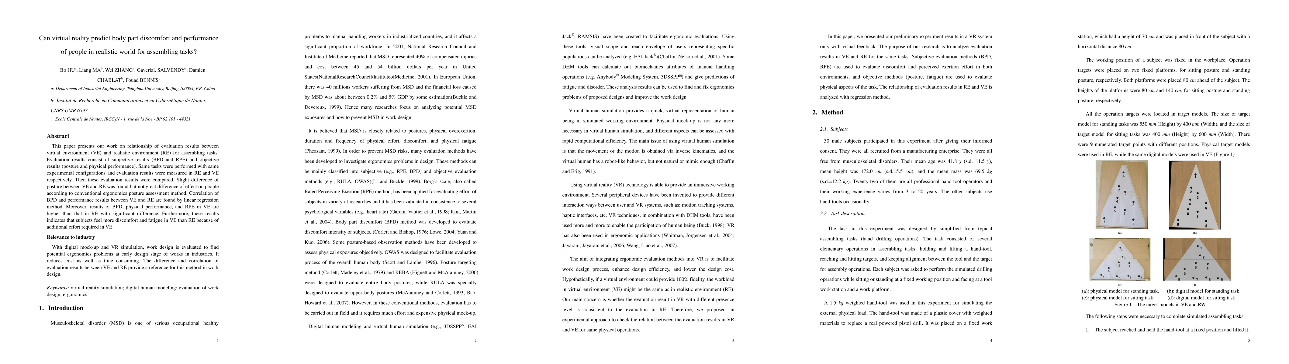 This paper presents our work on relationship of evaluation results between virtual environment (VE) and realistic environment (RE) for assembling tasks. Evaluation results consist of subjective results (BPD and RPE) and objective results (posture and physical performance). Same tasks were performed with same experimental configurations and evaluation results were measured in RE and VE respectively. Then these evaluation results were compared. Slight difference of posture between VE and RE was found but not great difference of effect on people according to conventional ergonomics posture assessment method. Correlation of BPD and performance results between VE and RE are found by linear regression method. Moreover, results of BPD, physical performance, and RPE in VE are higher than that in RE with significant difference. Furthermore, these results indicates that subjects feel more discomfort and fatigue in VE than RE because of additional effort required in VE.