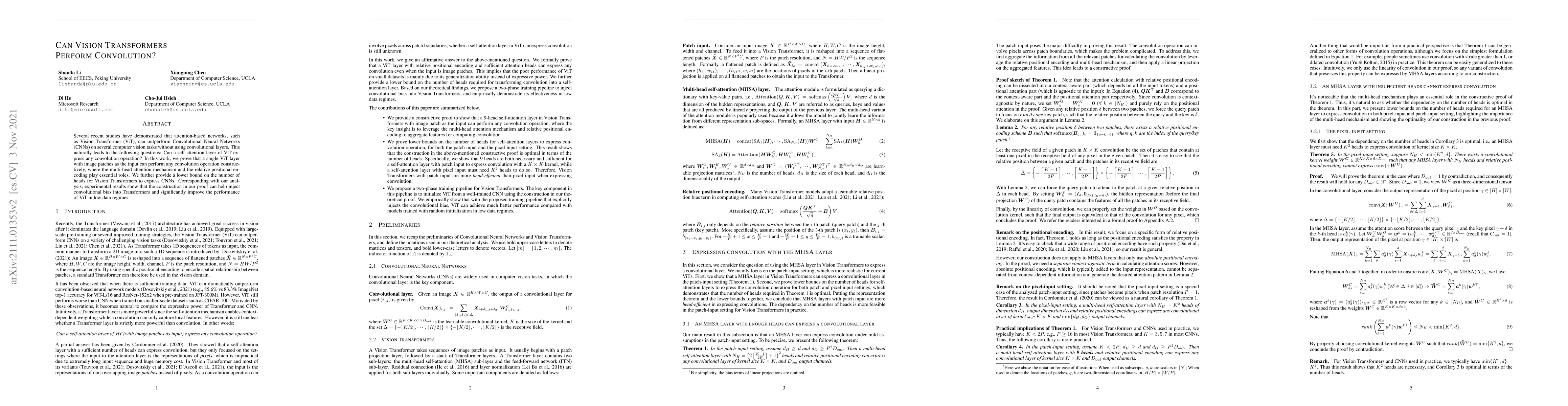 This paper proves that Vision Transformers (ViT) can perform any convolution operation through their self-attention layers, with the multi-head attention mechanism and relative positional encoding being crucial. Experimental results show that incorporating convolutional bias into ViTs enhances their performance, especially in low data scenarios.