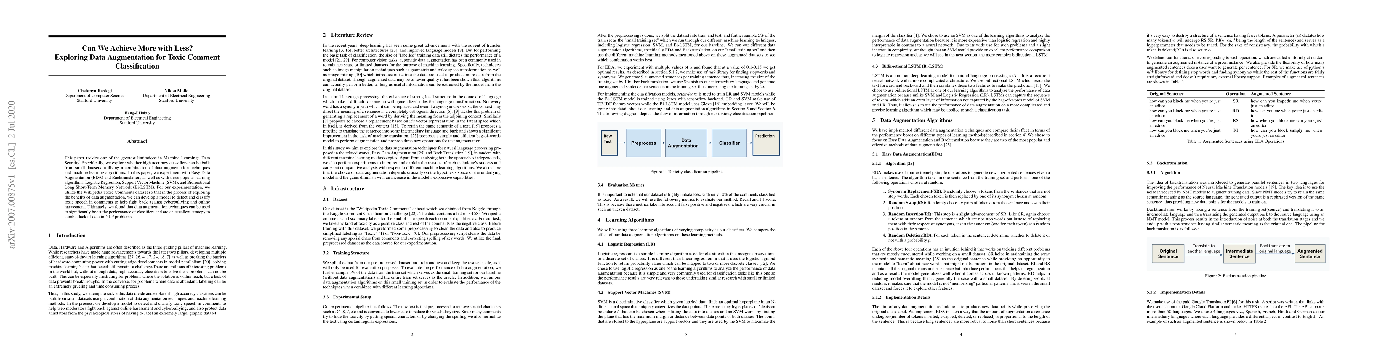 This paper tackles one of the greatest limitations in Machine Learning: Data Scarcity. Specifically, we explore whether high accuracy classifiers can be built from small datasets, utilizing a combination of data augmentation techniques and machine learning algorithms. In this paper, we experiment with Easy Data Augmentation (EDA) and Backtranslation, as well as with three popular learning algorithms, Logistic Regression, Support Vector Machine (SVM), and Bidirectional Long Short-Term Memory Network (Bi-LSTM). For our experimentation, we utilize the Wikipedia Toxic Comments dataset so that in the process of exploring the benefits of data augmentation, we can develop a model to detect and classify toxic speech in comments to help fight back against cyberbullying and online harassment. Ultimately, we found that data augmentation techniques can be used to significantly boost the performance of classifiers and are an excellent strategy to combat lack of data in NLP problems.