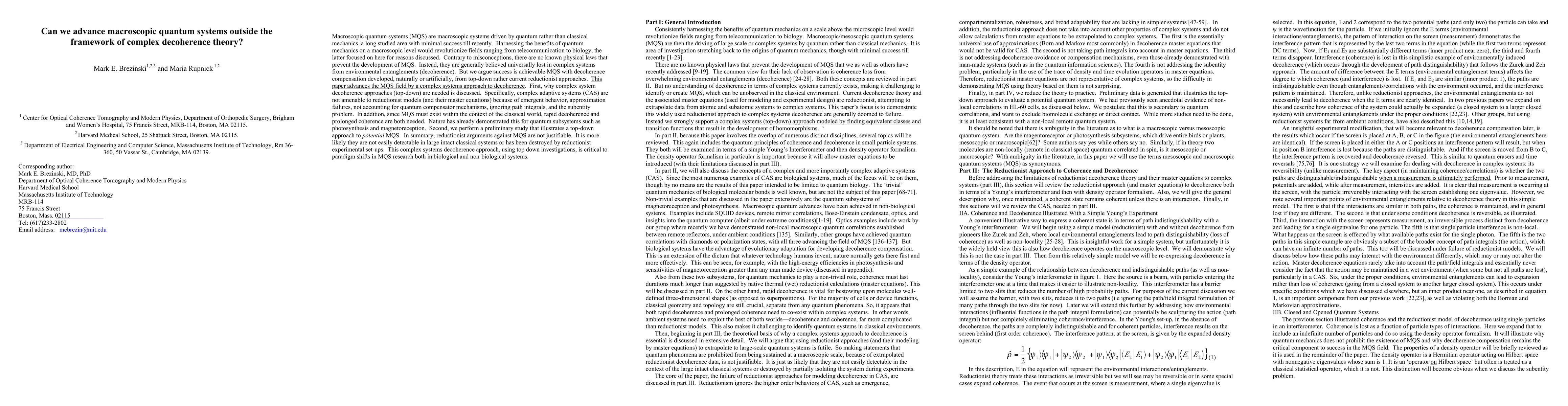 This paper argues that macroscopic quantum systems (MQS) can be advanced beyond traditional decoherence theory through a complex systems approach, emphasizing the need for top-down strategies to overcome reductionist limitations and emergent behavior. The study suggests that MQS can be sustained with decoherence compensation, highlighting the potential for significant advancements in fields like telecommunications and biology.