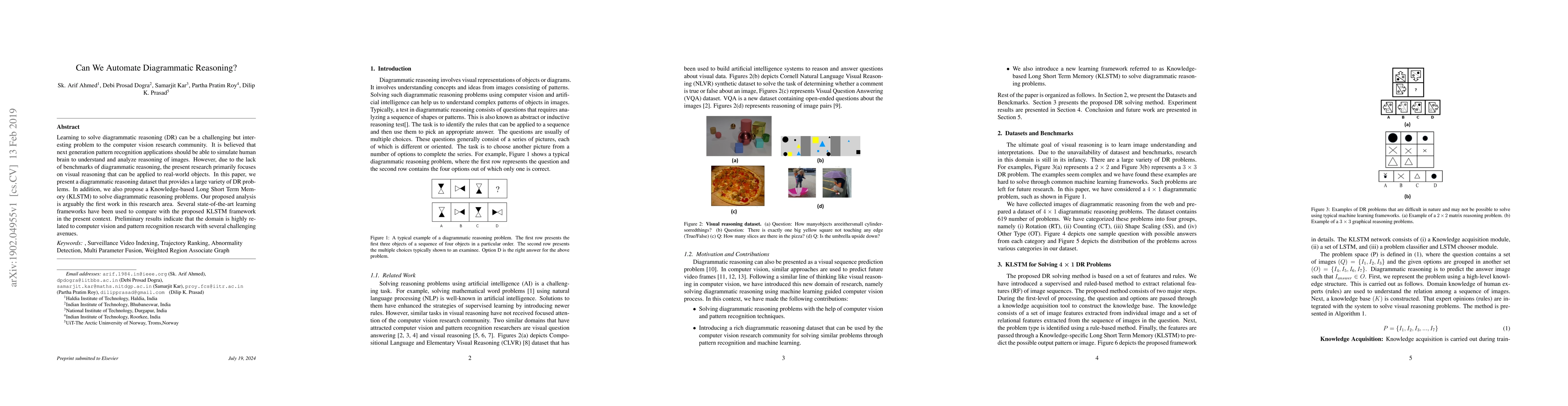 This paper introduces a new dataset for diagrammatic reasoning and proposes a Knowledge-based Long Short Term Memory (KLSTM) framework to tackle DR problems, marking the first analysis in this niche area. Comparative studies with state-of-the-art learning models indicate promising links to computer vision and pattern recognition.