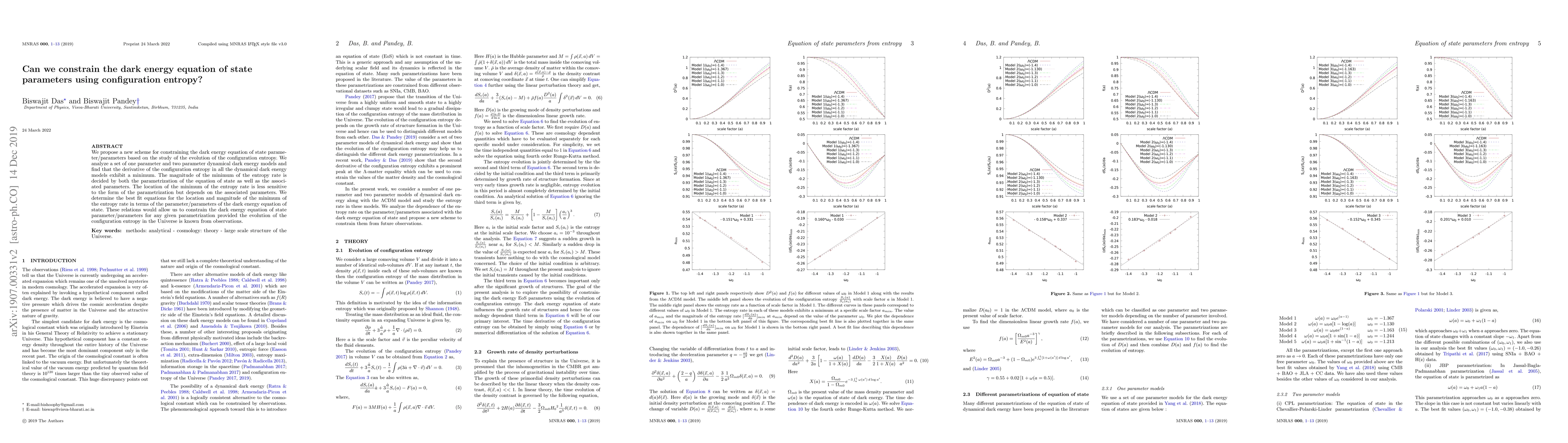 This paper proposes a novel method to constrain dark energy equation of state parameters using the evolution of configuration entropy. The study finds that the derivative of configuration entropy exhibits a minimum in various dynamical dark energy models, with the minimum's magnitude and location providing constraints on the dark energy parameters.