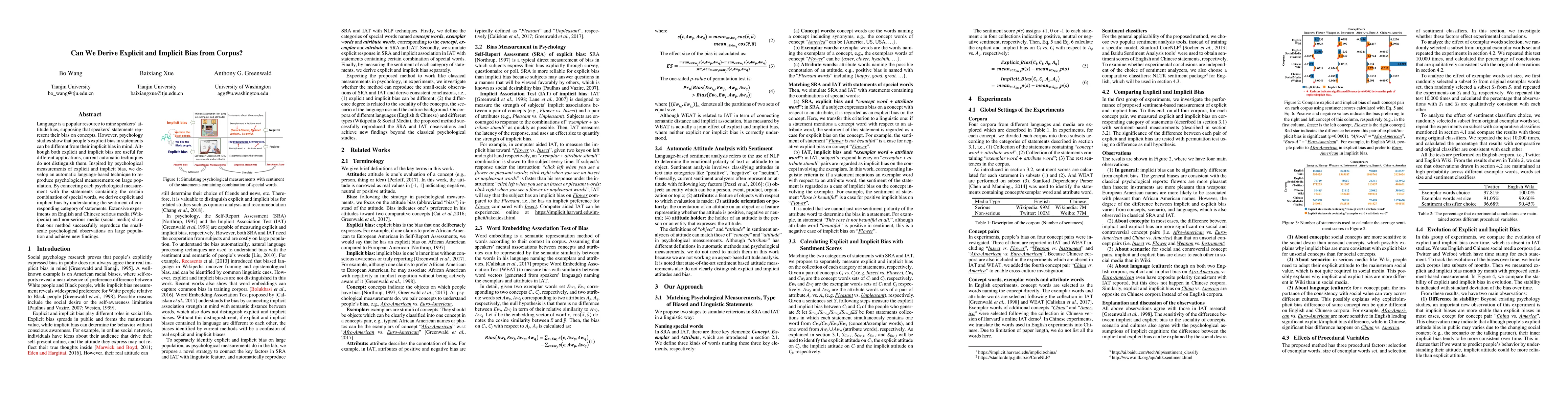Language is a popular resource to mine speakers' attitude bias, supposing that speakers' statements represent their bias on concepts. However, psychology studies show that people's explicit bias in statements can be different from their implicit bias in mind. Although both explicit and implicit bias are useful for different applications, current automatic techniques do not distinguish them. Inspired by psychological measurements of explicit and implicit bias, we develop an automatic language-based technique to reproduce psychological measurements on large population. By connecting each psychological measurement with the statements containing the certain combination of special words, we derive explicit and implicit bias by understanding the sentiment of corresponding category of statements. Extensive experiments on English and Chinese serious media (Wikipedia) and non-serious media (social media) show that our method successfully reproduce the small-scale psychological observations on large population and achieve new findings.