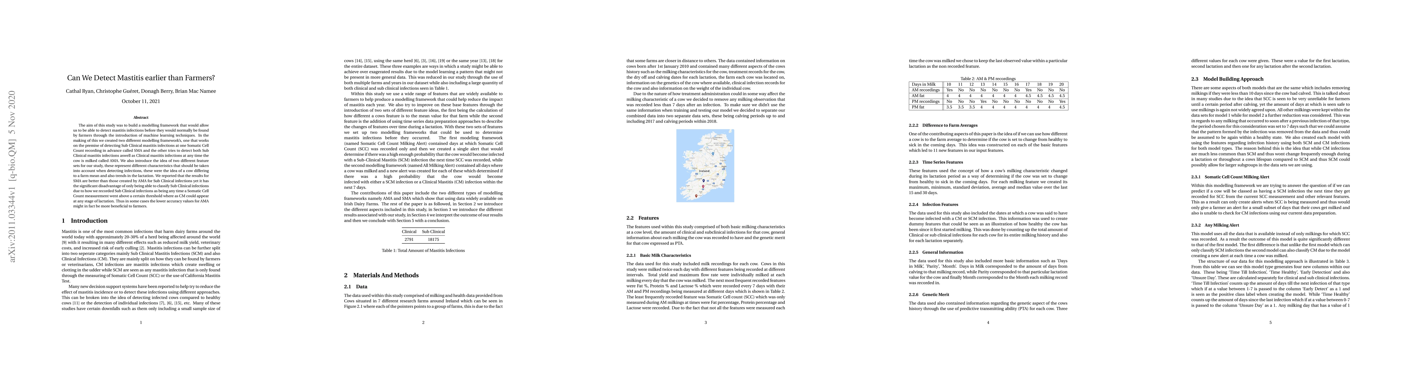 The aim of this study was to build a modelling framework that would allow us to be able to detect mastitis infections before they would normally be found by farmers through the introduction of machine learning techniques. In the making of this we created two different modelling framework's, one that works on the premise of detecting Sub Clinical mastitis infections at one Somatic Cell Count recording in advance called SMA and the other tries to detect both Sub Clinical mastitis infections aswell as Clinical mastitis infections at any time the cow is milked called AMA. We also introduce the idea of two different feature sets for our study, these represent different characteristics that should be taken into account when detecting infections, these were the idea of a cow differing to a farm mean and also trends in the lactation. We reported that the results for SMA are better than those created by AMA for Sub Clinical infections yet it has the significant disadvantage of only being able to classify Sub Clinical infections due to how we recorded Sub Clinical infections as being any time a Somatic Cell Count measurement went above a certain threshold where as CM could appear at any stage of lactation. Thus in some cases the lower accuracy values for AMA might in fact be more beneficial to farmers.