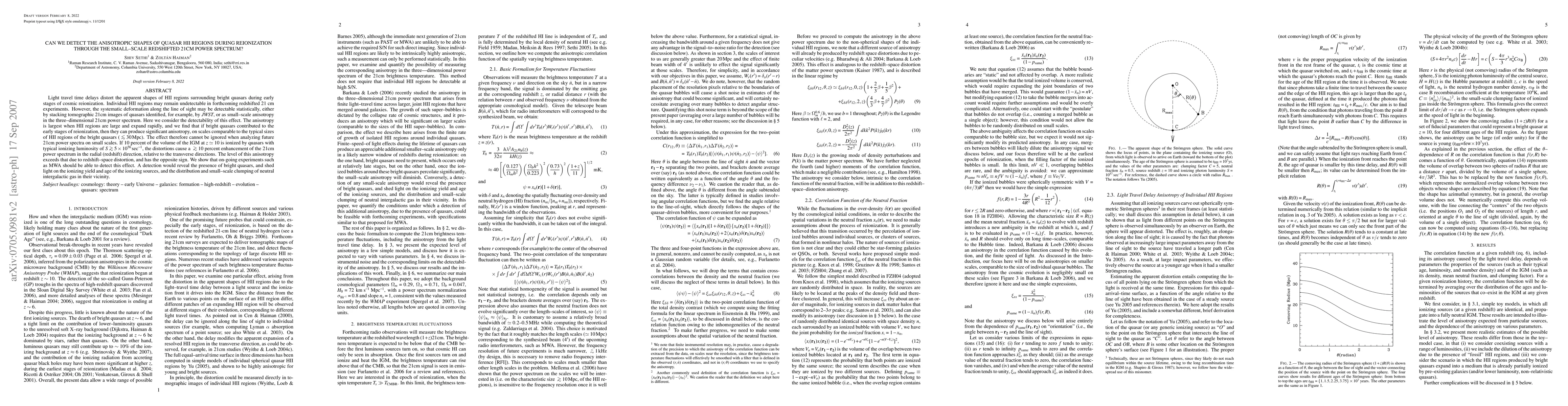 Light travel time delays distort the apparent shapes of HII regions surrounding bright quasars during early stages of cosmic reionization. Individual HII regions may remain undetectable in forthcoming redshifted 21 cm experiments. However, the systematic deformation along the line of sight may be detectable statistically, either by stacking tomographic 21cm images of quasars identified, for example, by JWST, or as small-scale anisotropy in the three-dimensional 21cm power spectrum. Here we consider the detectability of this effect. The anisotropy is largest when HII regions are large and expand rapidly, and we find that if bright quasars contributed to the early stages of reionization, then they can produce significant anisotropy, on scales comparable to the typical sizes of HII regions of the bright quasars (approx. 30 Mpc and below). The effect therefore cannot be ignored when analyzing future 21cm power spectra on small scales. If 10 percent of the volume of the IGM at redshift z=10 is ionized by quasars with typical ionizing luminosity of S= 5 x 10^{56} photons/second, the distortions can enhance by more than 10 percent the 21cm power spectrum in the radial (redshift) direction, relative to the transverse directions. The level of this anisotropy exceeds that due to redshift-space distortion, and has the opposite sign. We show that on-going experiments such as MWA should be able to detect this effect. A detection would reveal the presence of bright quasars, and shed light on the ionizing yield and age of the ionizing sources, and the distribution and small-scale clumping of neutral intergalactic gas in their vicinity.