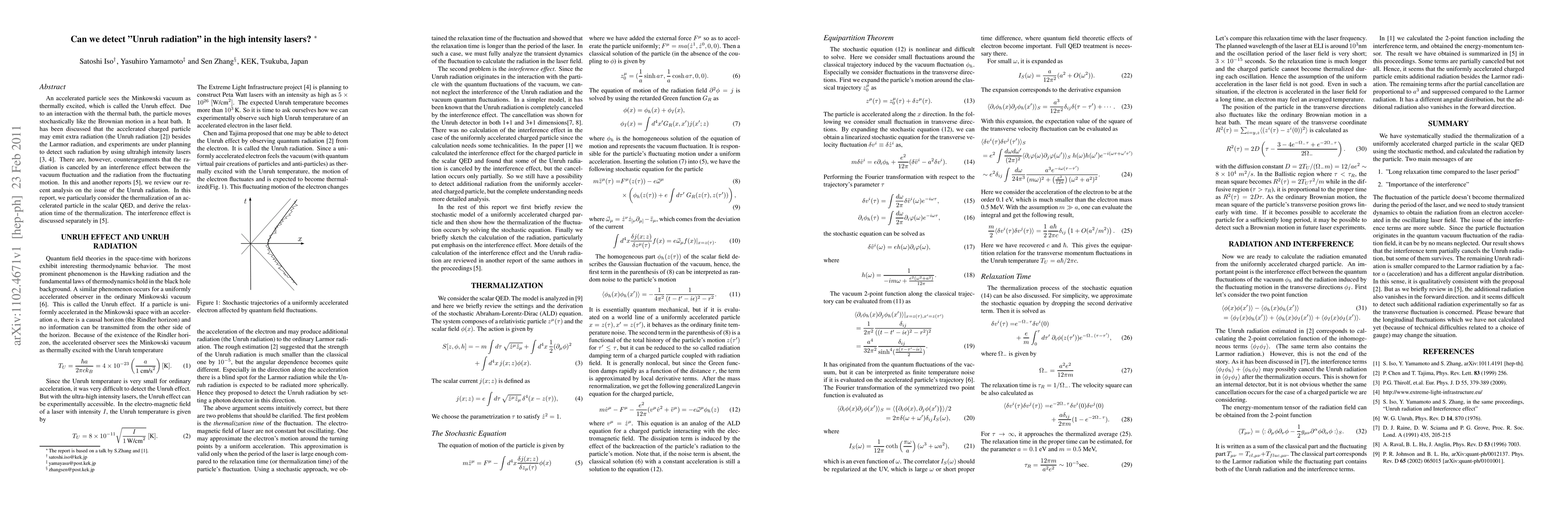 This paper reviews recent analyses on detecting Unruh radiation, which is extra radiation emitted by an accelerated charged particle due to the Unruh effect. The study investigates the thermalization of particles in scalar QED and derives the relaxation time for thermalization, addressing ongoing debates about potential interference effects that could cancel the radiation.