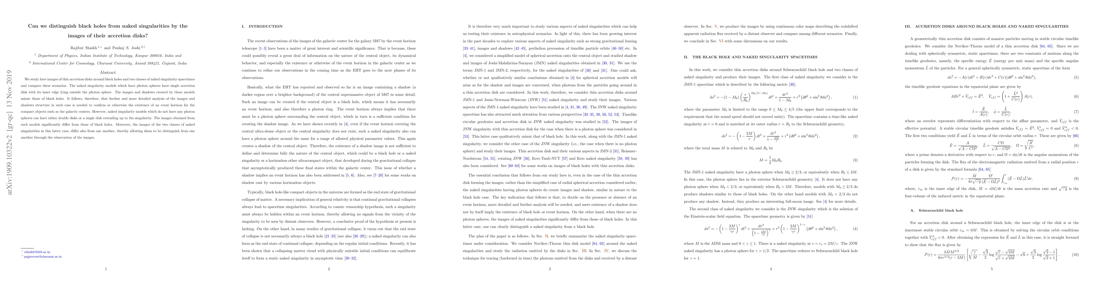 This paper investigates whether black holes can be distinguished from naked singularities based on the images of their accretion disks. While naked singularities with photon spheres mimic black hole images, those without photon spheres exhibit distinct double disk or extended single disk images, allowing for differentiation from black holes.