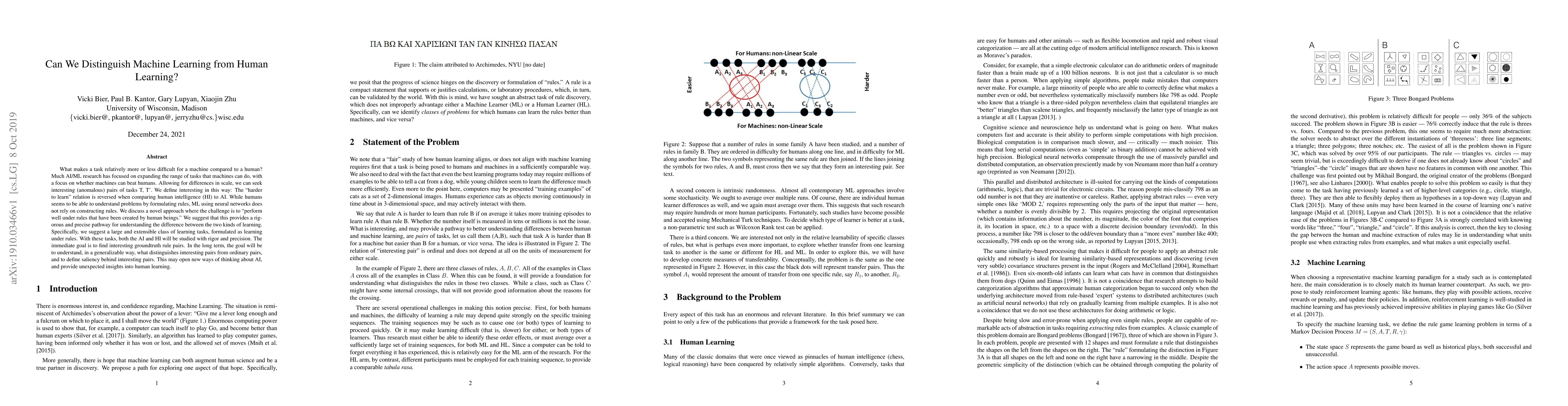 What makes a task relatively more or less difficult for a machine compared to a human? Much AI/ML research has focused on expanding the range of tasks that machines can do, with a focus on whether machines can beat humans. Allowing for differences in scale, we can seek interesting (anomalous) pairs of tasks T, T'. We define interesting in this way: The "harder to learn" relation is reversed when comparing human intelligence (HI) to AI. While humans seems to be able to understand problems by formulating rules, ML using neural networks does not rely on constructing rules. We discuss a novel approach where the challenge is to "perform well under rules that have been created by human beings." We suggest that this provides a rigorous and precise pathway for understanding the difference between the two kinds of learning. Specifically, we suggest a large and extensible class of learning tasks, formulated as learning under rules. With these tasks, both the AI and HI will be studied with rigor and precision. The immediate goal is to find interesting groundtruth rule pairs. In the long term, the goal will be to understand, in a generalizable way, what distinguishes interesting pairs from ordinary pairs, and to define saliency behind interesting pairs. This may open new ways of thinking about AI, and provide unexpected insights into human learning.