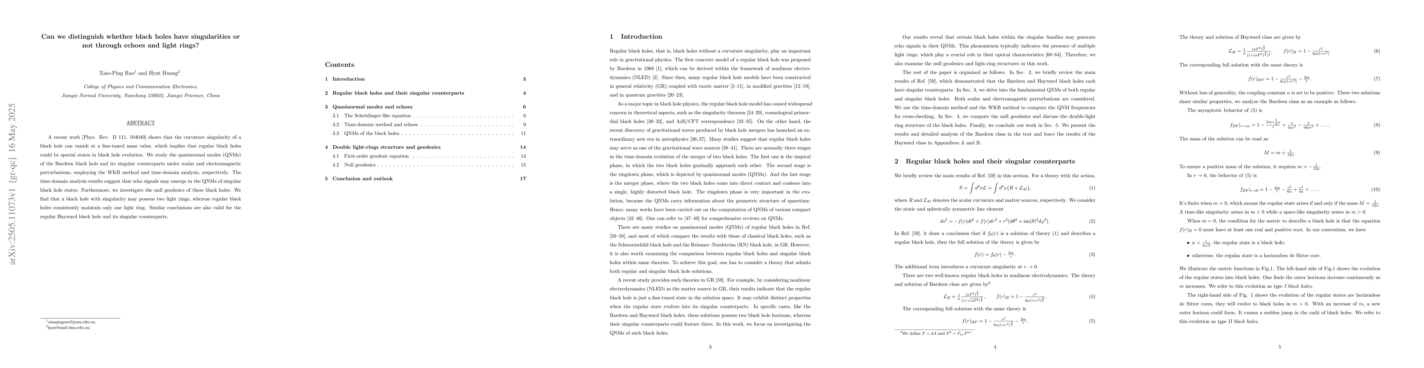 The work builds on the idea of fine-tuned mass values causing singularity vanishing and investigates echo and light ring differences between regular and singular black holes, offering a novel approach to probing black hole interiors.