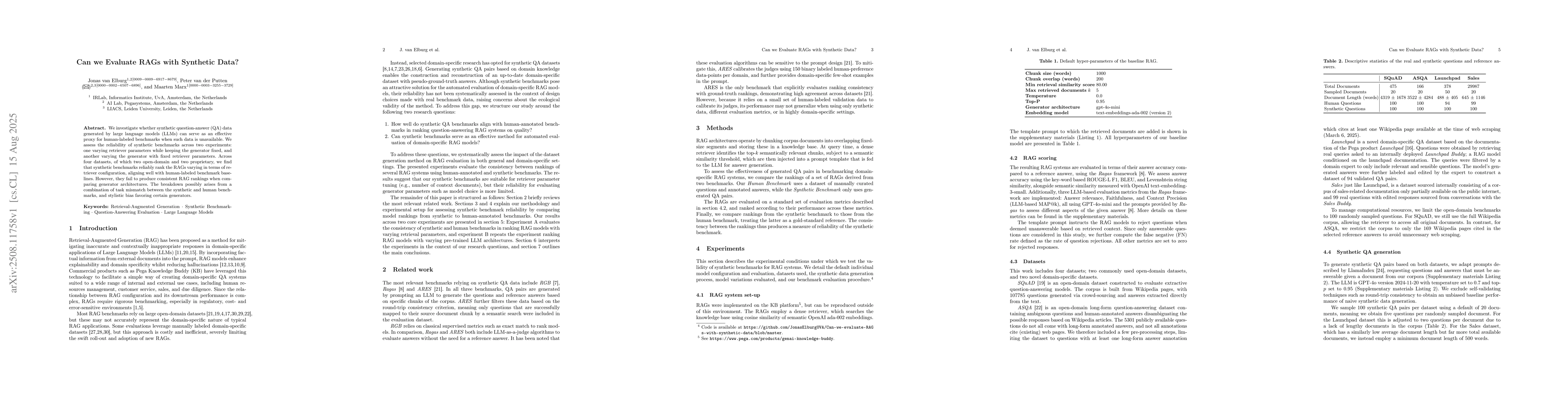 We investigate whether synthetic question-answer (QA) data generated by large language models (LLMs) can serve as an effective proxy for human-labeled benchmarks when such data is unavailable. We assess the reliability of synthetic benchmarks across two experiments: one varying retriever parameters while keeping the generator fixed, and another varying the generator with fixed retriever parameters. Across four datasets, of which two open-domain and two proprietary, we find that synthetic benchmarks reliably rank the RAGs varying in terms of retriever configuration, aligning well with human-labeled benchmark baselines. However, they fail to produce consistent RAG rankings when comparing generator architectures. The breakdown possibly arises from a combination of task mismatch between the synthetic and human benchmarks, and stylistic bias favoring certain generators.