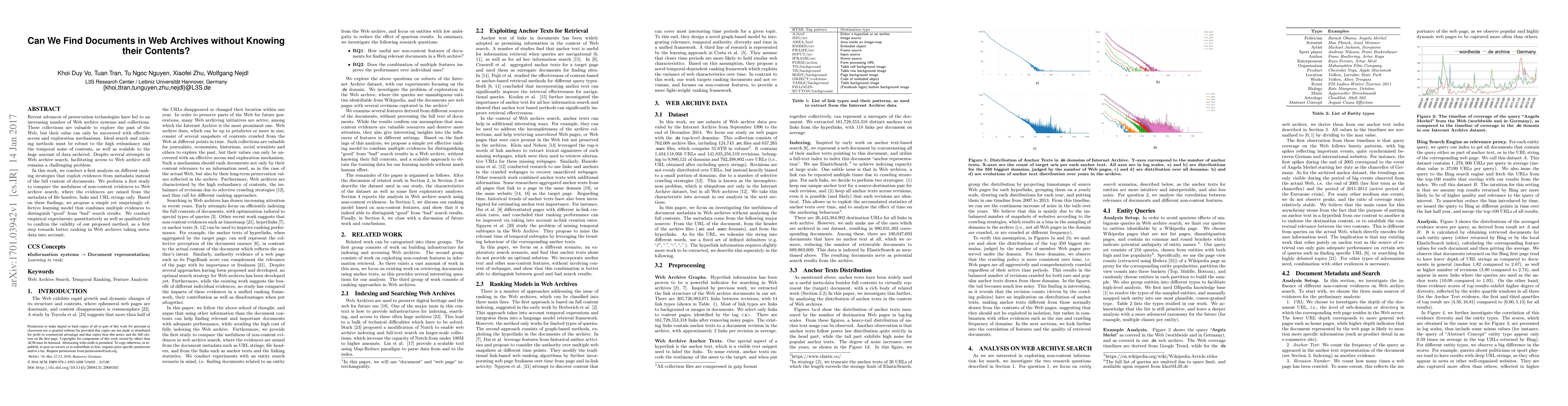 This paper investigates alternative ranking strategies for searching Web archives by leveraging metadata instead of document content. The authors propose a learning model that combines metadata from file headers, links, and URLs to improve search results, demonstrating its effectiveness through empirical experiments.