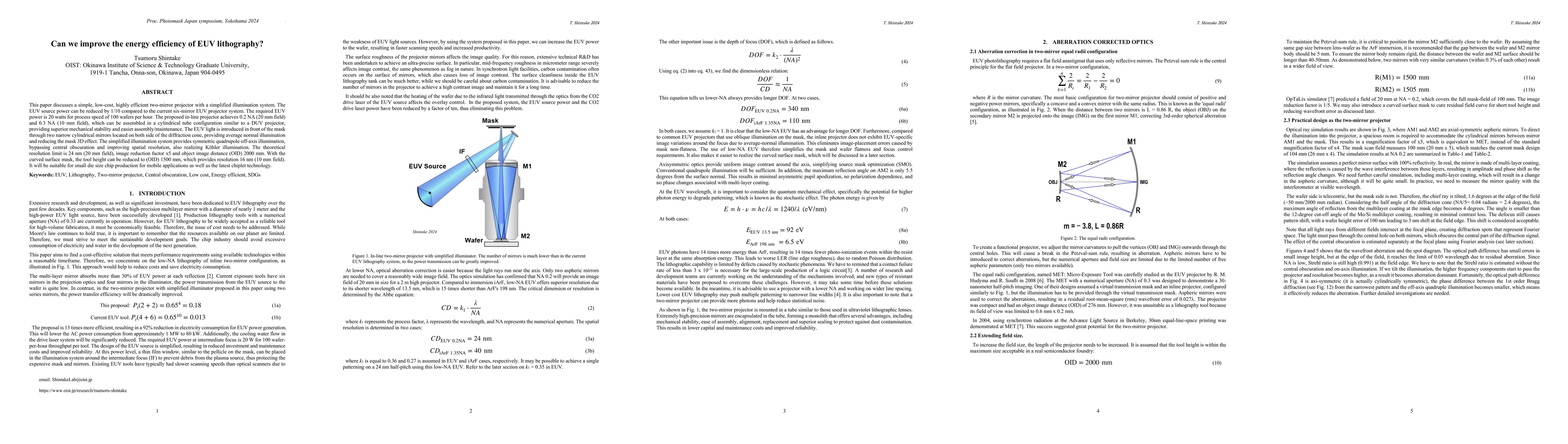 This paper proposes a cost-effective, two-mirror EUV lithography projector that reduces EUV source power by tenfold compared to existing six-mirror systems, enabling 20 watts for 100 wafers per hour with enhanced mechanical stability and simplified maintenance.